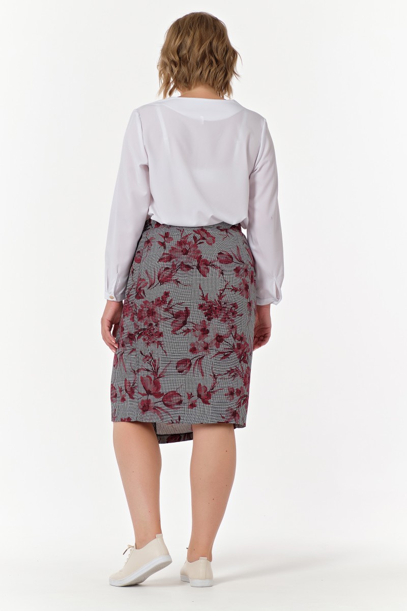 Блузка полуприлегающего силуэта из креповой ткани с длинными втачными рукавами. Низ рукавов с защипами и притачными манжетами застегивающимися на 1 пуговицу. Перед с нагрудными вытачками асимметричный по резу переда ложная застежка с декоративными пугов
