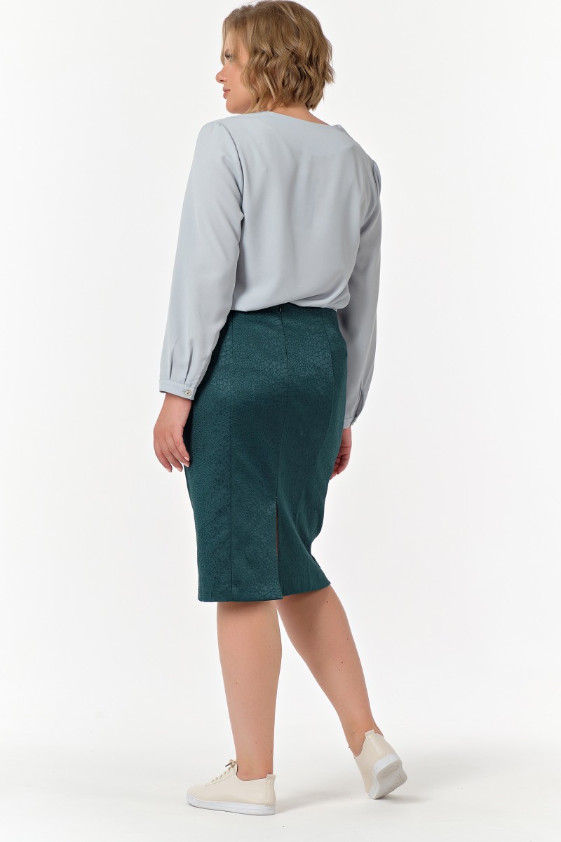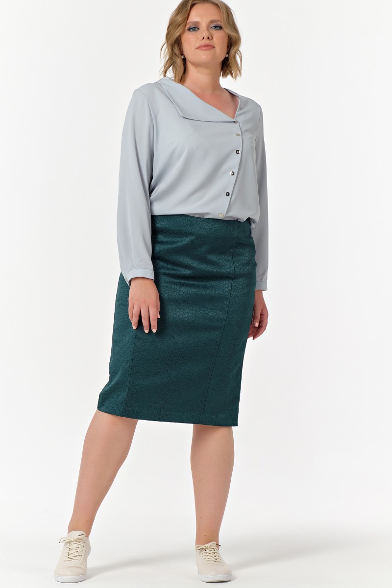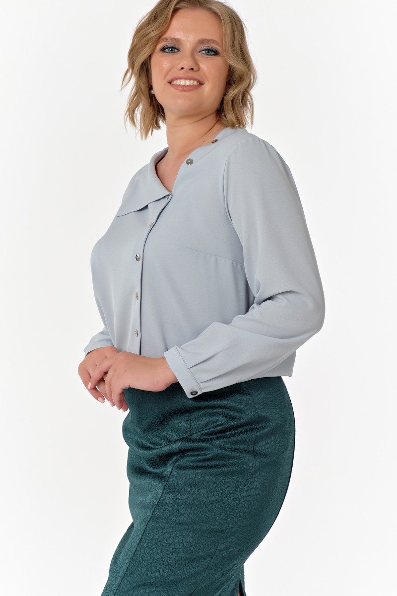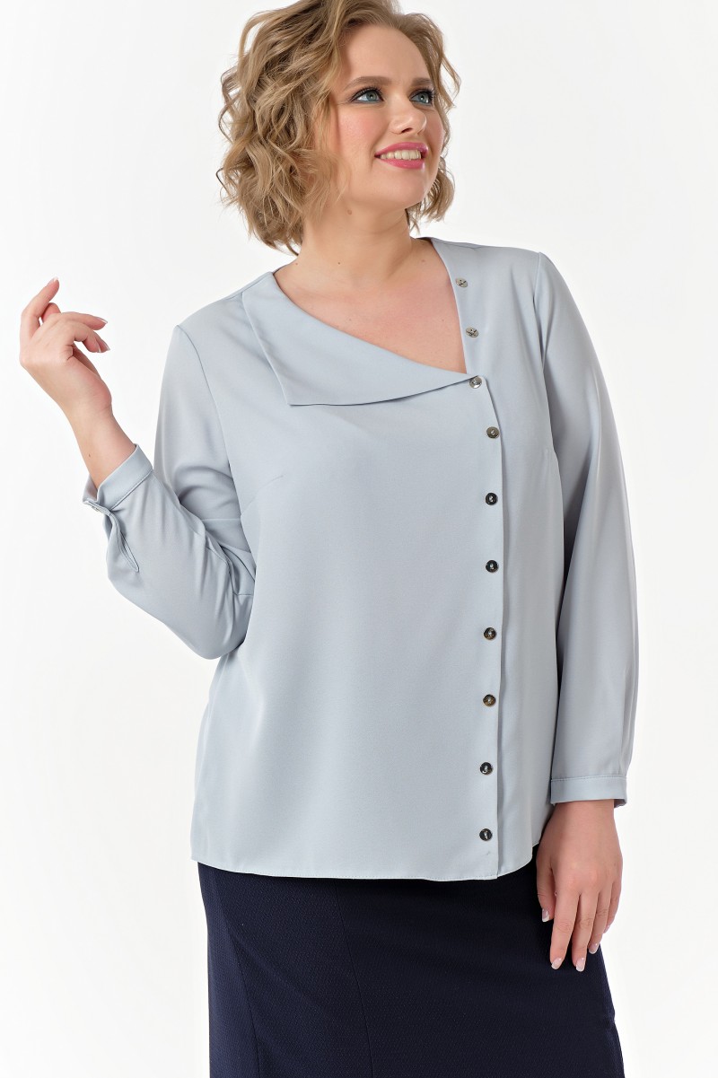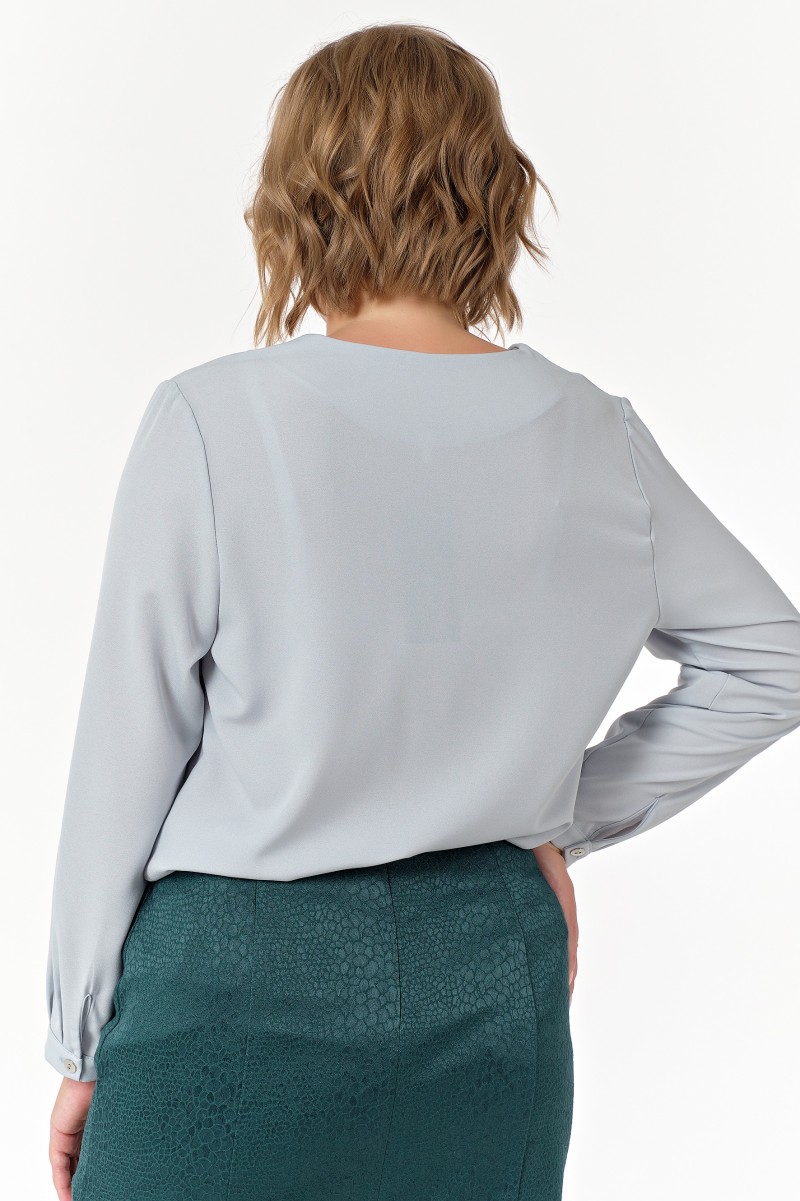 Блузка полуприлегающего силуэта из креповой ткани с длинными втачными рукавами. Низ рукавов с защипами и притачными манжетами застегивающимися на 1 пуговицу. Перед с нагрудными вытачками асимметричный по резу переда ложная застежка с декоративными пугов