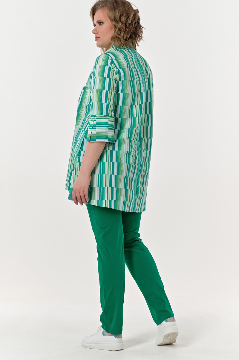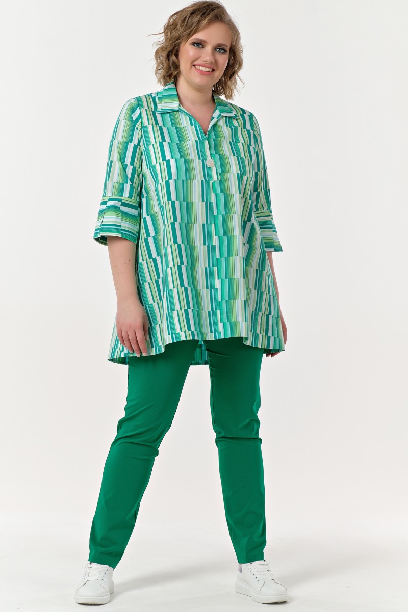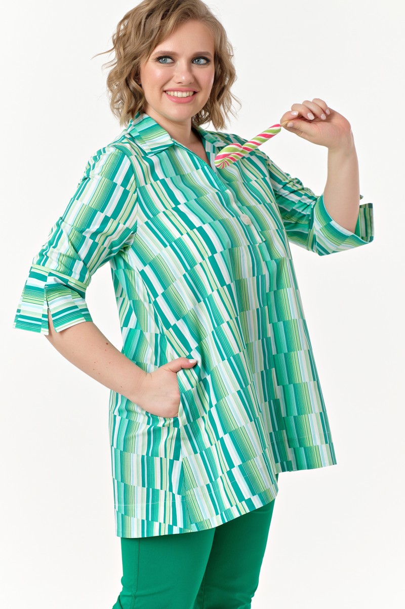 Блузка расклешенная к низу с карманами в боковых швах. Перед – со средним швом без вытачек. Спинка – со средним швом. Горловина V-образная асимметричная с декоративным элементом по центру. Воротник отложной. /Рукава – втачные длиной ниже локтя с широким