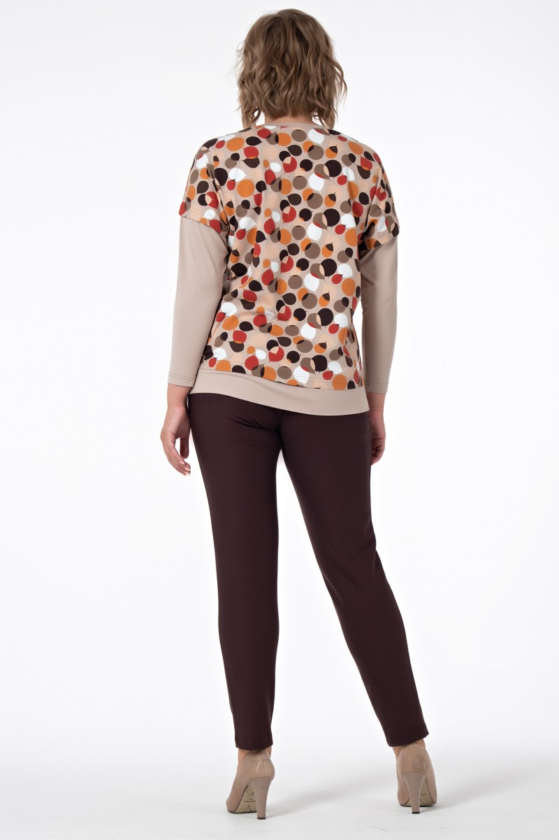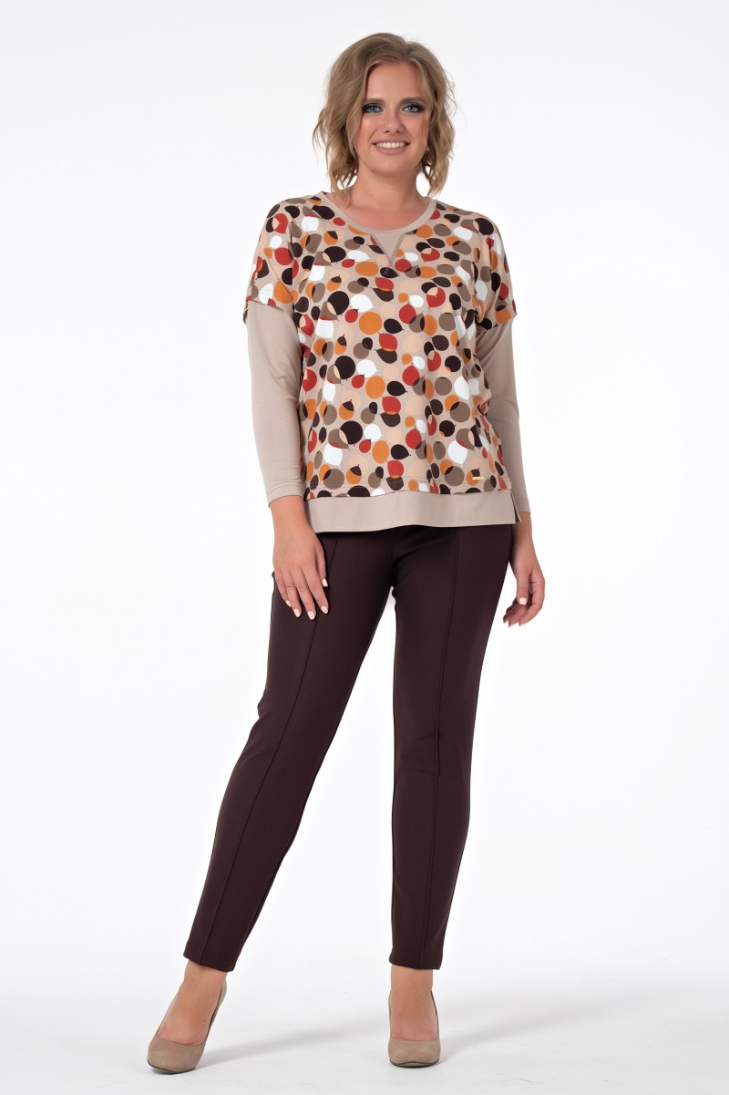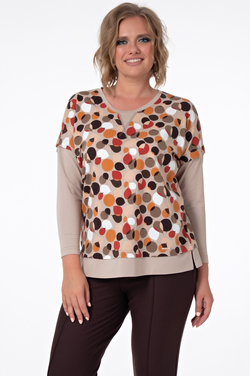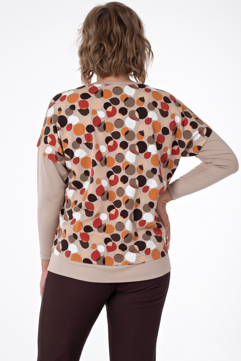 Джемпер женский прямого силуэта комбинированный. Рукава длинные цельнокроенные с членением выше локтя. Горловина круглая с отделочной деталью в форме треугольника обработана бейкой. По низу притачная широкая бейка с разрезами по бокам.