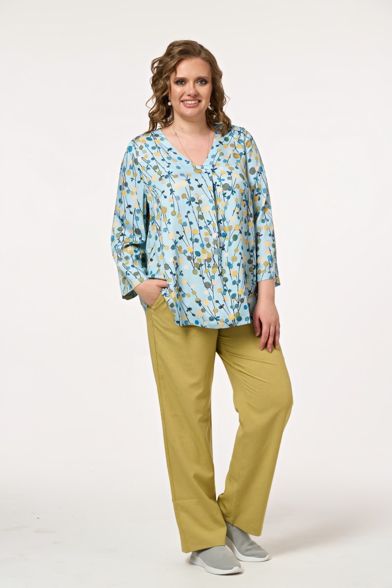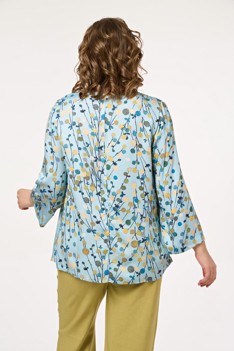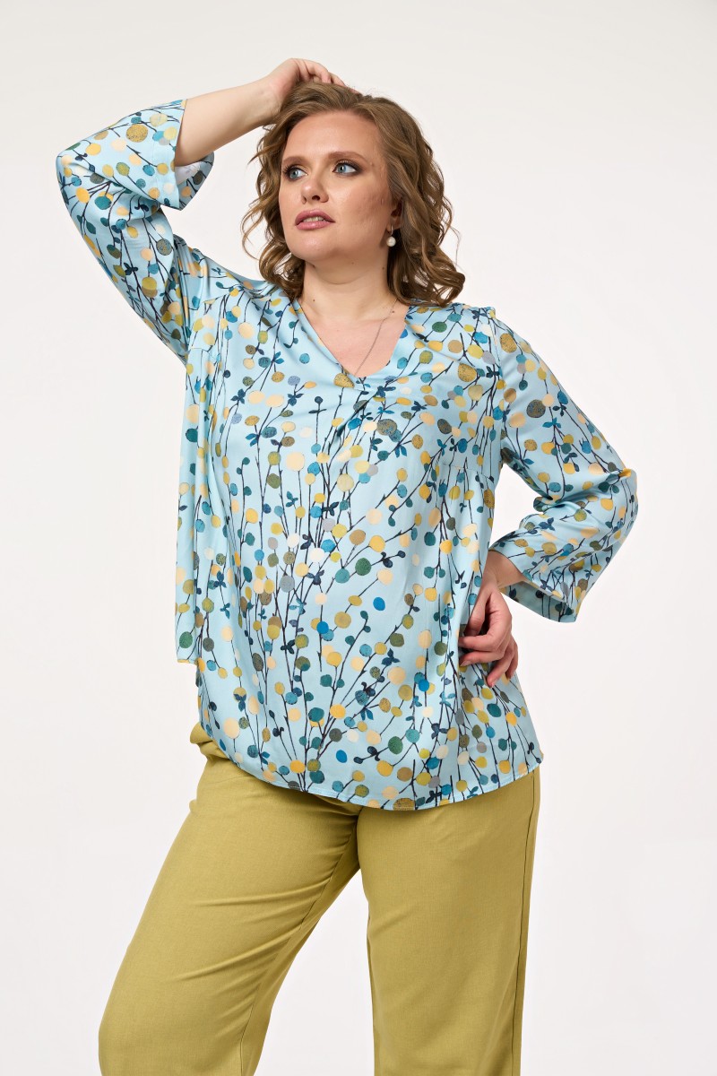 Блузка расклешенная к низу с V-образным вырезом горловина обработана обтачкой. Перед с нагрудными вытачками выходящими из бокового шва с мягкой складкой.