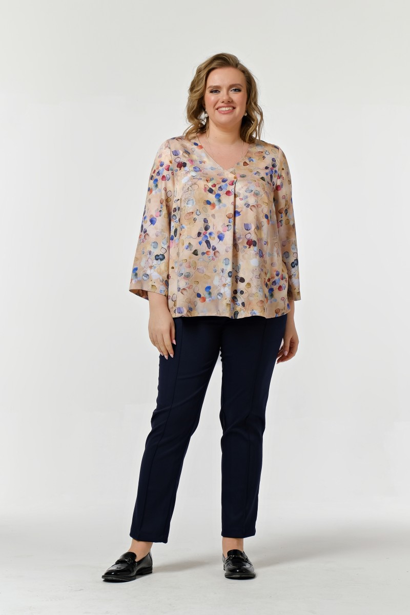 Блузка расклешенная к низу с V-образным вырезом горловина обработана обтачкой. Перед с нагрудными вытачками выходящими из бокового шва с мягкой складкой.
