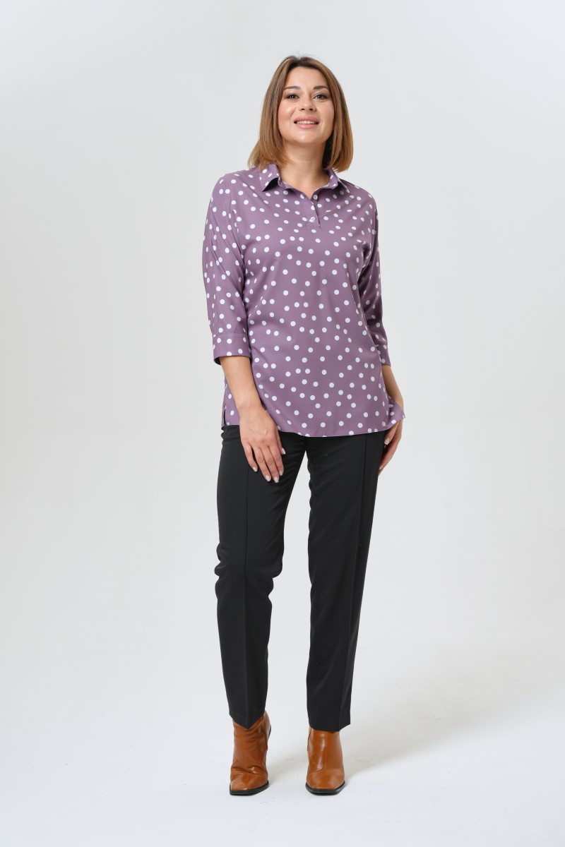 Блузка женская полуприлегающего силуэта с разрезами в боковых швах с цельнокроеными рукавами длиной 7/8 с воротником. Перед – с центральной декоративной планкой застёгивающейся на две обмётанные петли и две пуговицы.