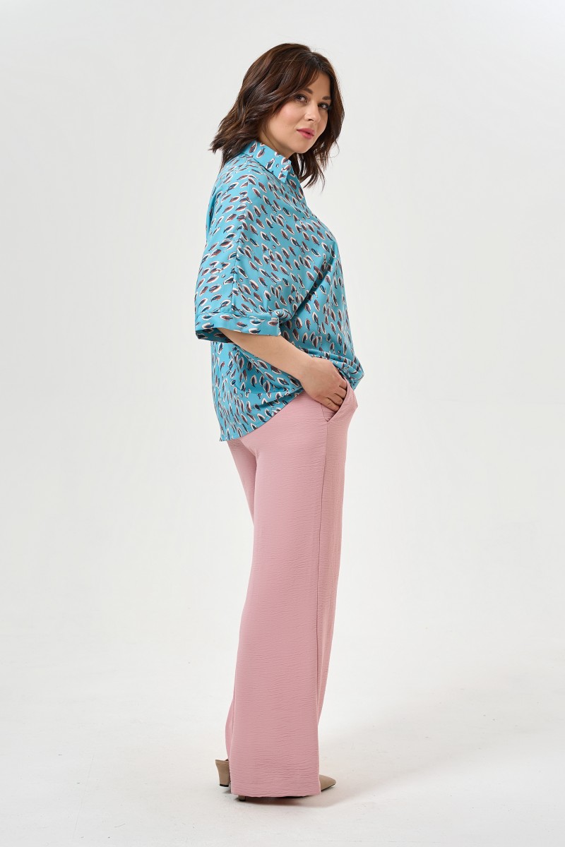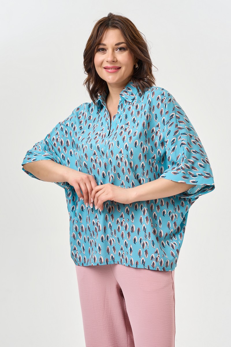 Удобная блузка с принтом перо на бирюзовом фоне и воротником поло.