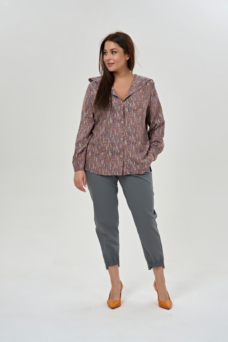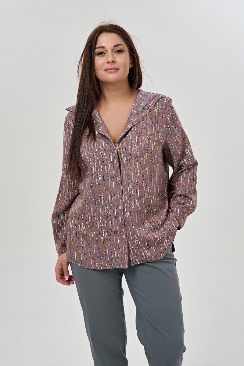Блузка женская прямого силуэта с капюшоном. По переду грудовые вытачки центральная застежка на петли и пуговицы.Рукава втачные длинные по низу рукава два защипа направленные к центру (встречные).
