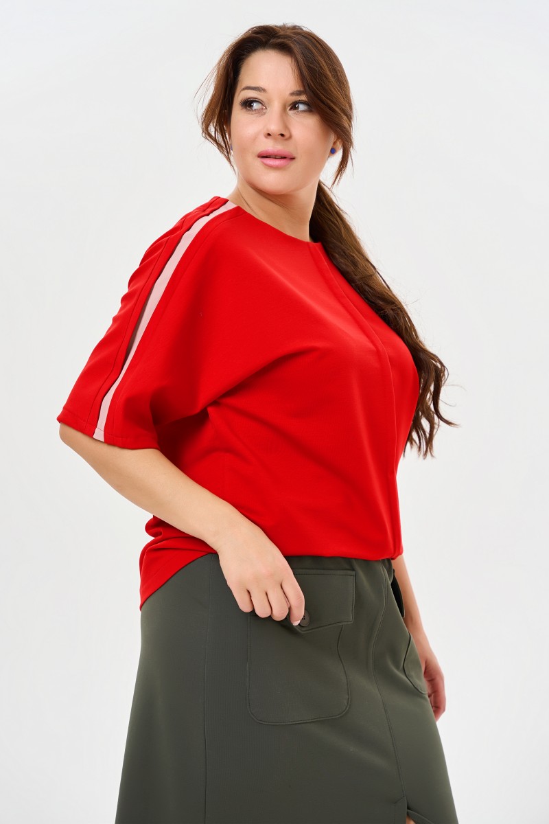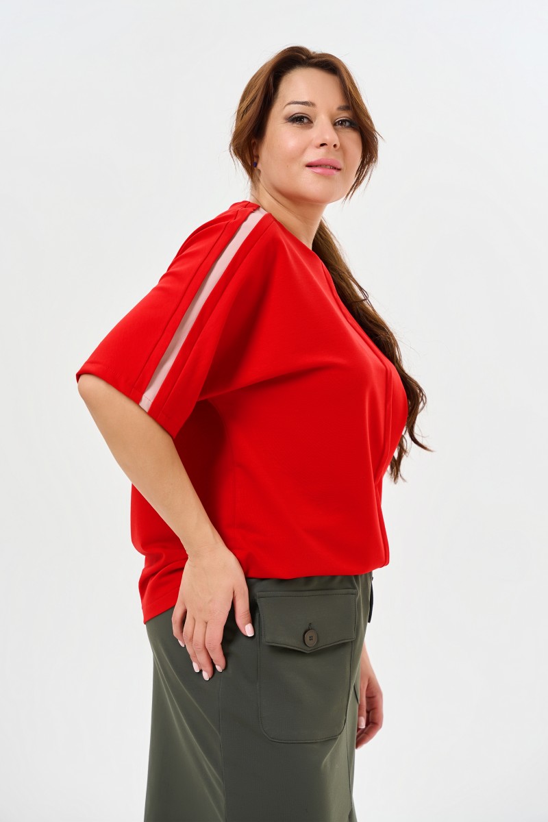 Блузка женская из трикотажного полотна с цельнокроеным рукавом длиной до локтя и с кокеткой из отделочной ткани вдоль плечевого шва.