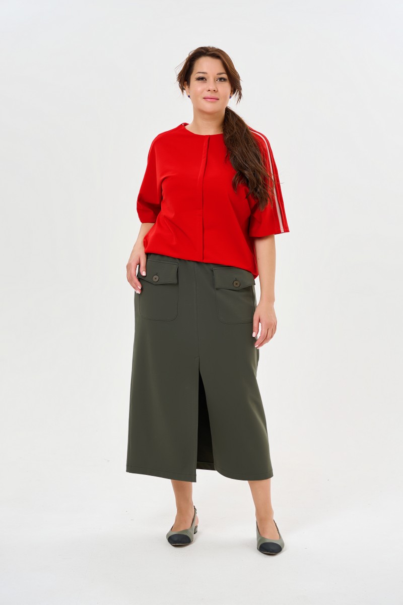 Блузка женская из трикотажного полотна с цельнокроеным рукавом длиной до локтя круглый вырез горловины обработан обтачкой.Перед с центральной вертикальной складкой с кокеткой из отделочной ткани вдоль плечевого шва в швы притачивания кокетки вставлены бейки.Спинка со средним швом.Размеры задвоены.