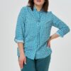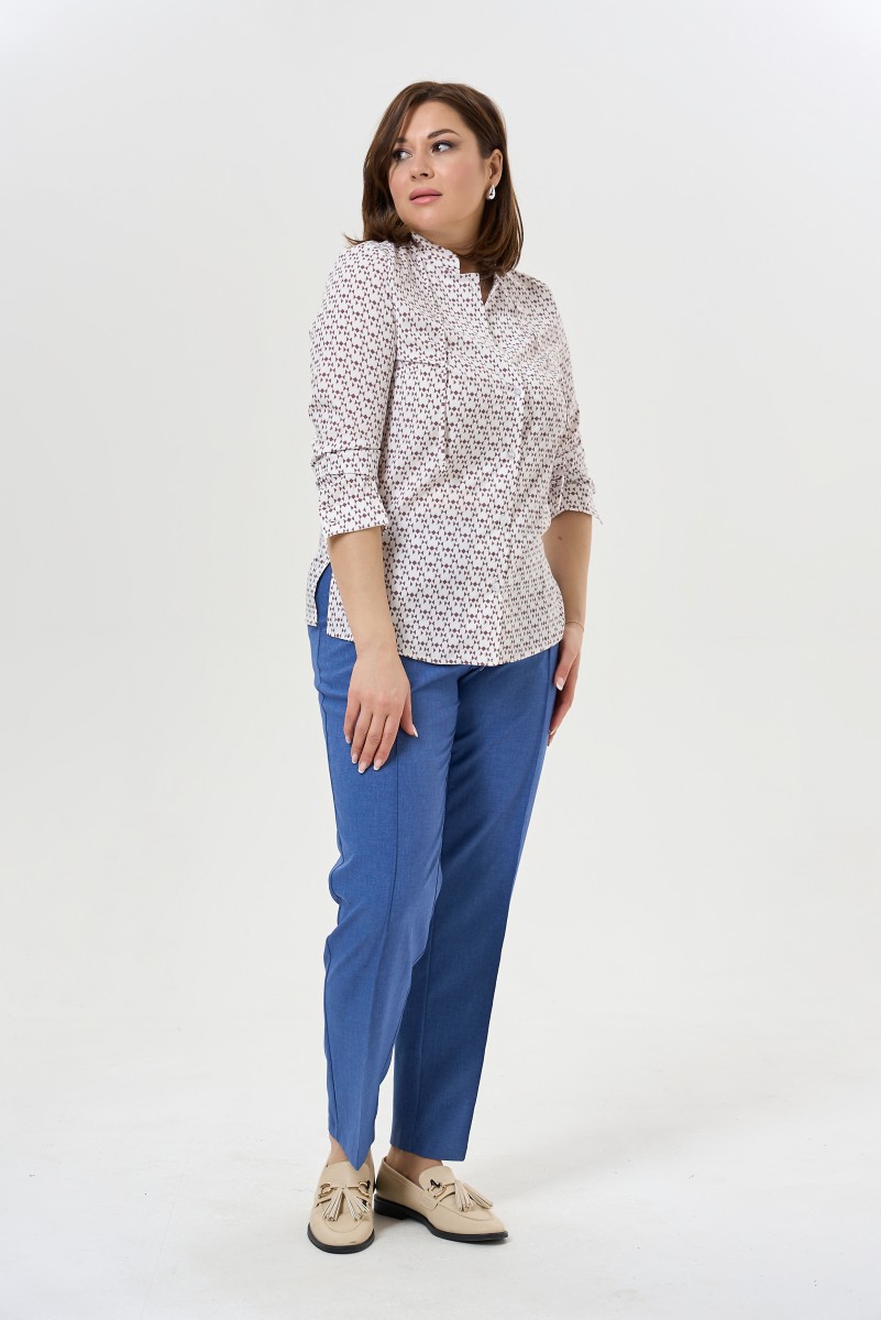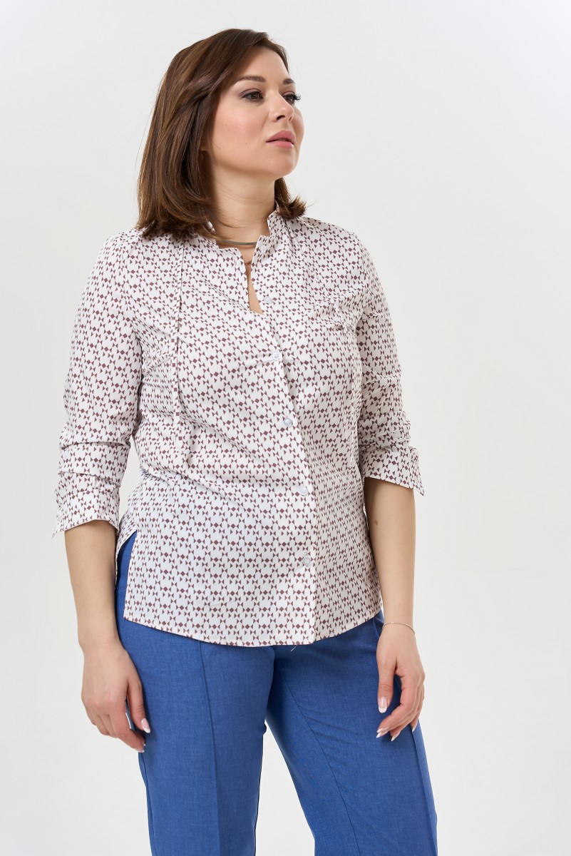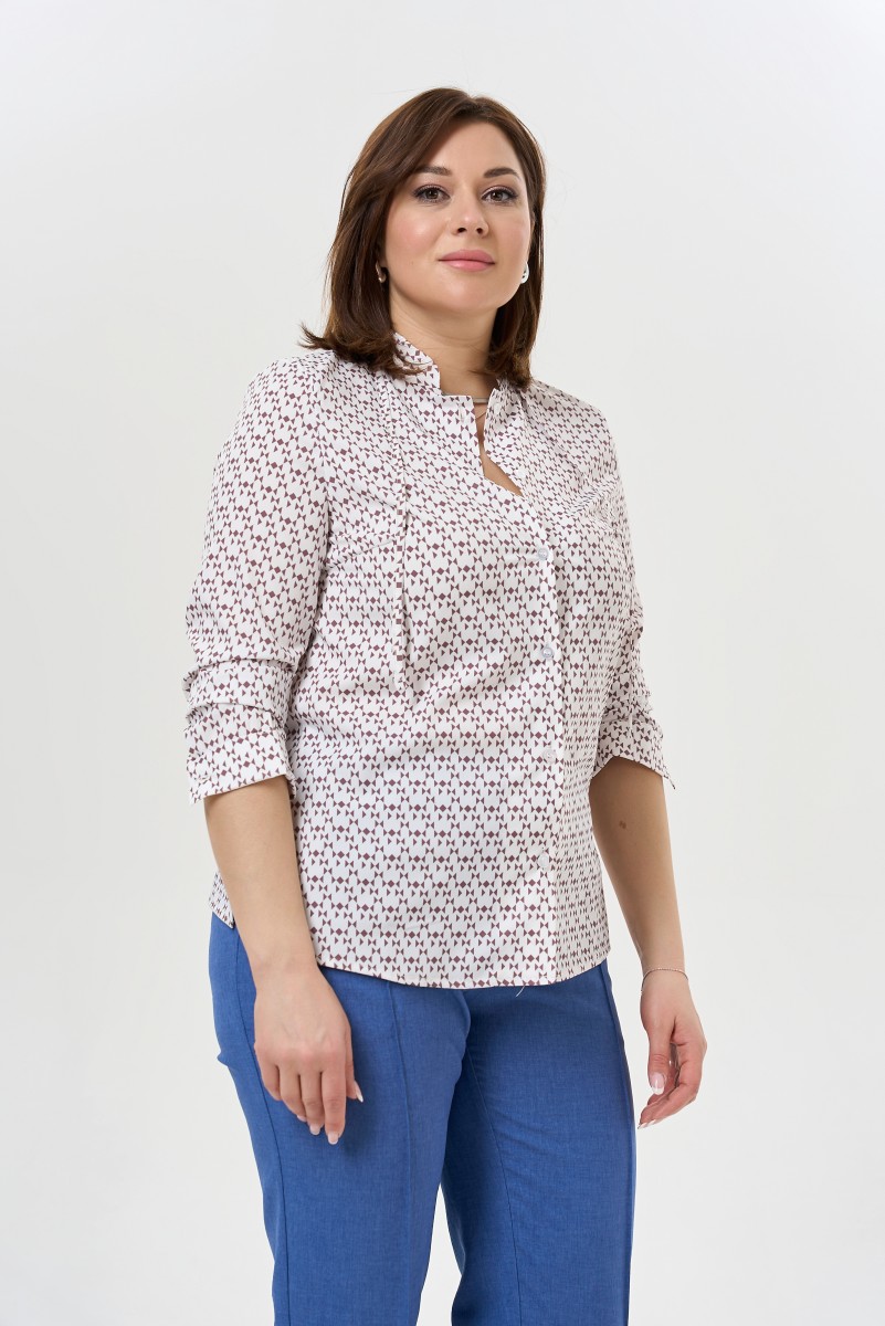 Блузка женская классическая прямого силуэта. По спинке плечевые вытачки. Застежка центральная на 6 петель и пуговиц. Рукава втачные по низу защип и притачная манжета. Воротник – стойка с завязкой. По низу бокового шва разрез.