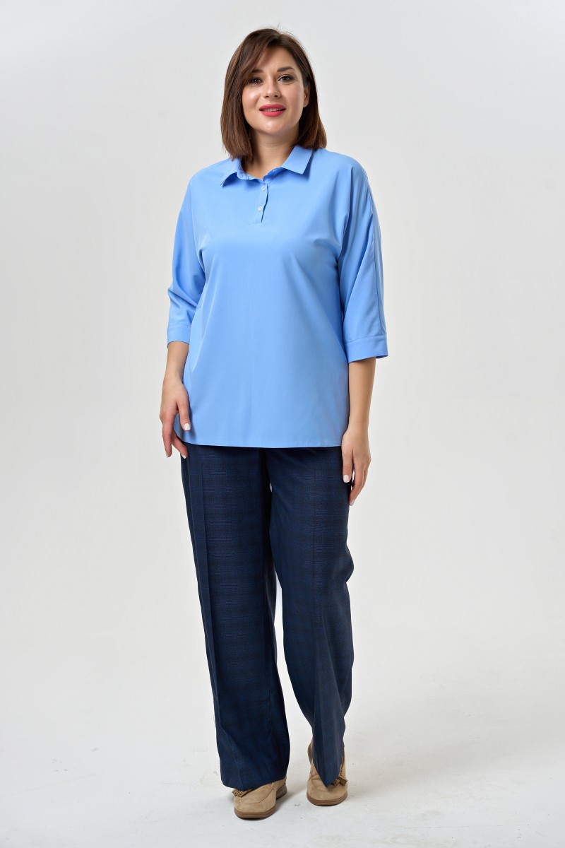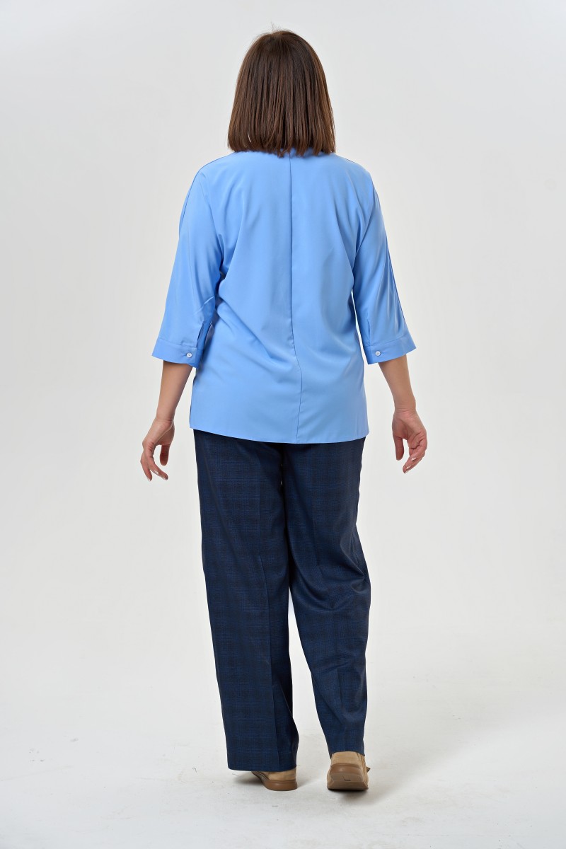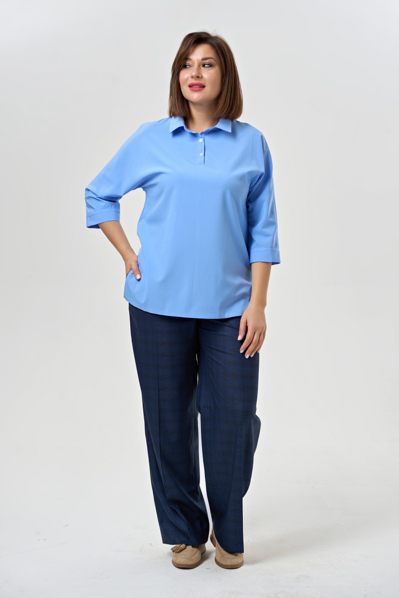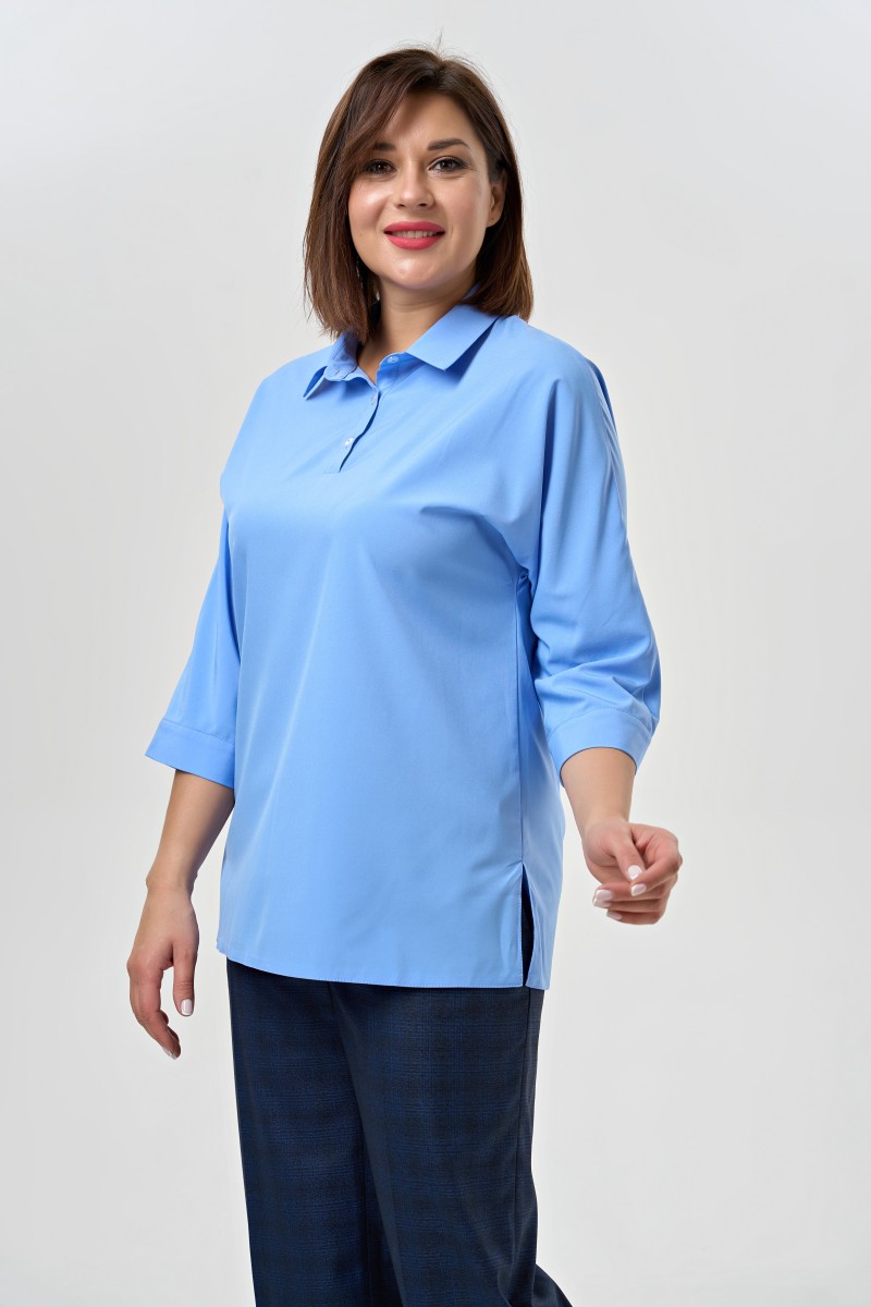 Блузка женская полуприлегающего силуэта с разрезами в боковых швах с цельнокроеными рукавами длиной 7/8 с воротником. Перед – с центральной декоративной планкой застёгивающейся на две обмётанные петли и две пуговицы.
