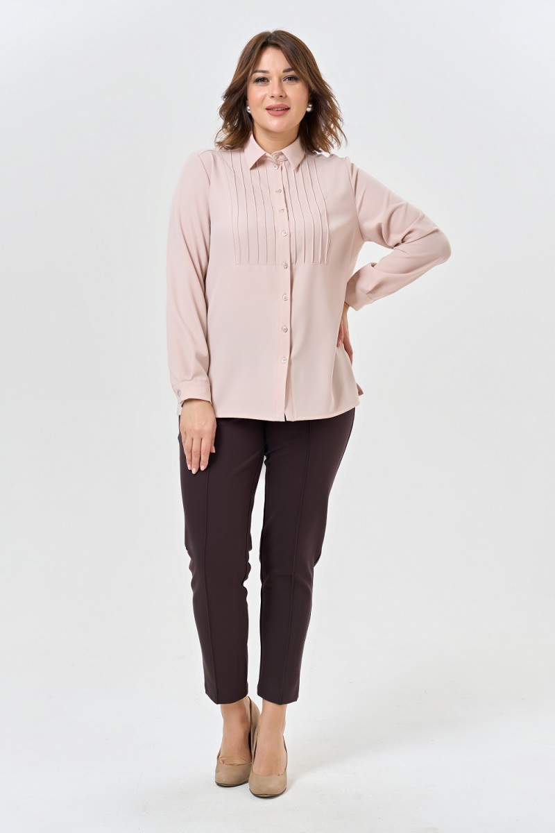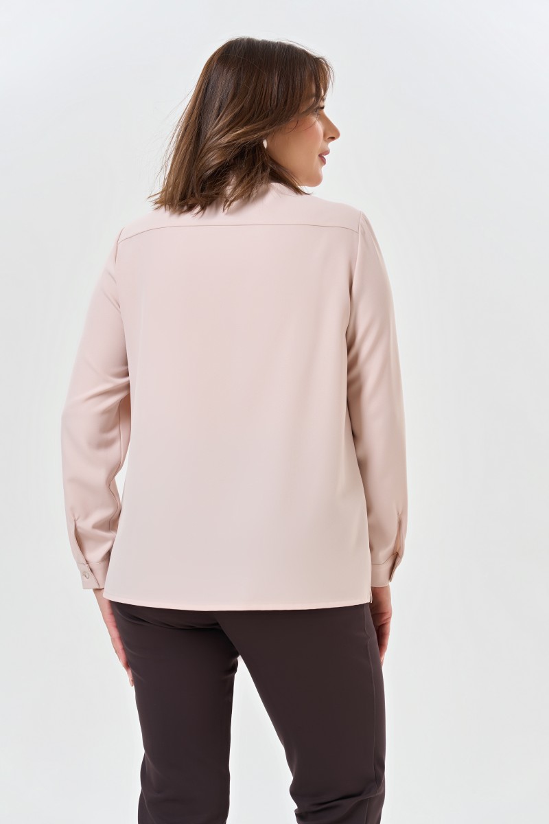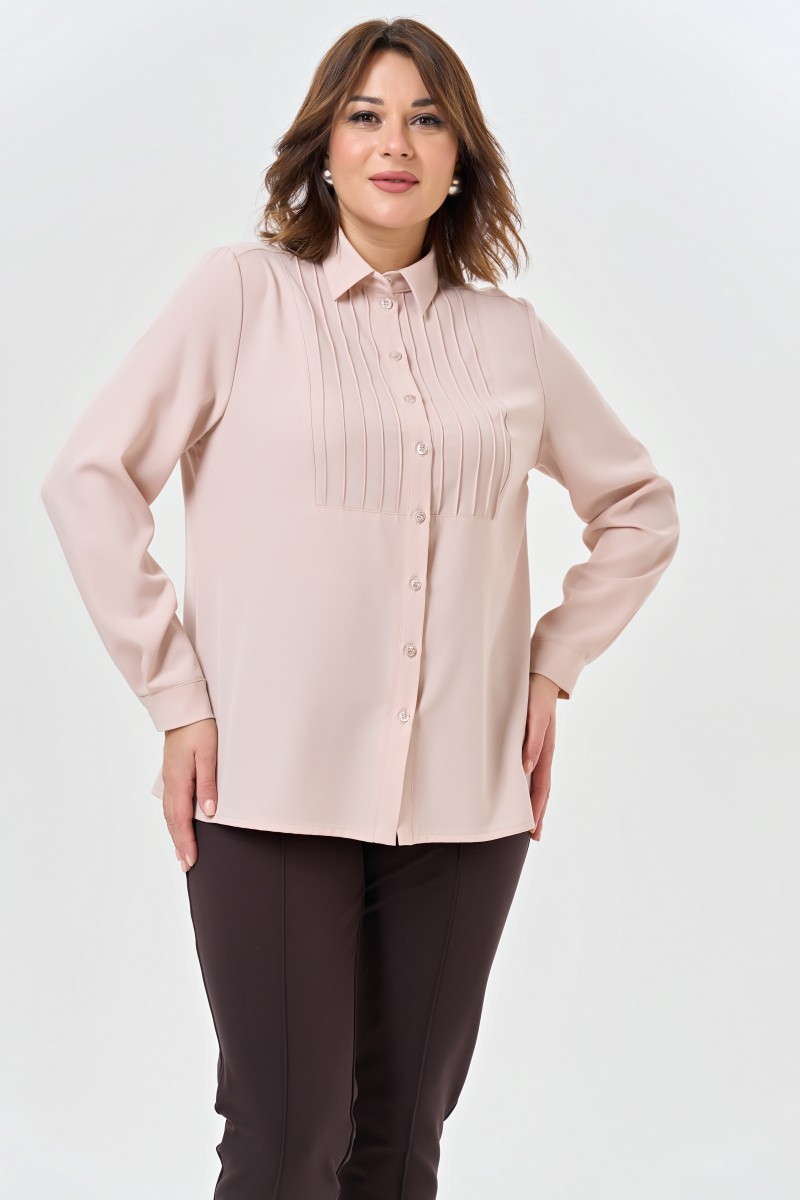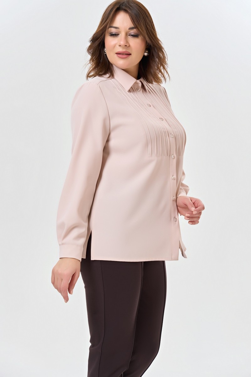 Блузка женская полуприлегающего силуэта с отложным воротником на притачной стойке с разрезами в боковых швах. Перед с кокеткой с застроченными складками с центральной застежкой на 9 петель и пуговиц на притачной планке. Спинка на кокетке.