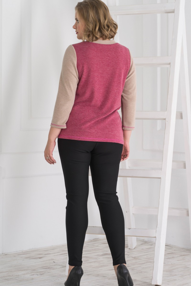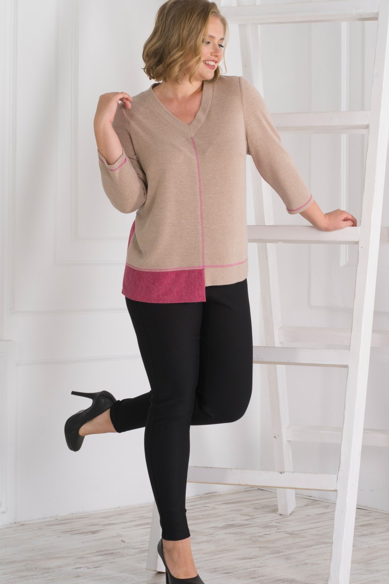 Джемпер – из трикотажного полотна/ полуприлегающего силуэта/ с втачными рукавами длиной 7/8/ с V-образной горловиной обработанной притачной бейкой. Перед – со средним швом/ с нагрудными вытачками выходящими из бокового шва/ со вставками по низу: левой –