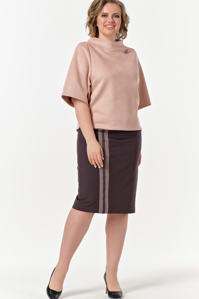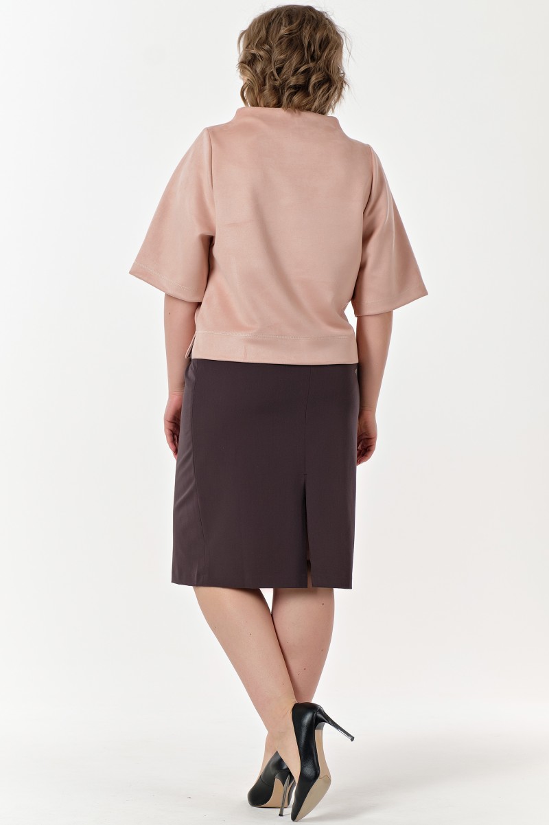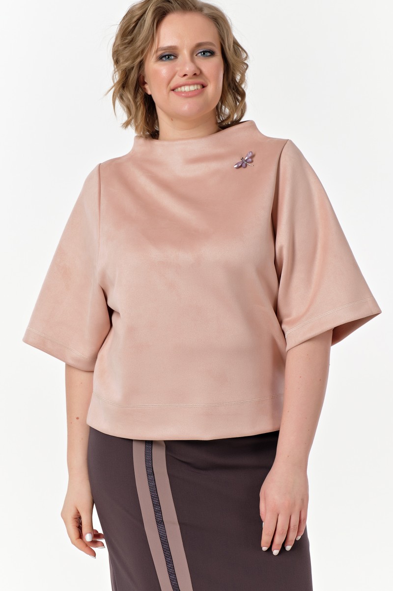 Джемпер – из плотного трикотажного полотна/ прямого силуэта/ длиной выше линии бёдер/ с разрезами в нижней части боковых швов/ с широкими втачными рукавами длиной 3/4/ с цельнокроеным воротником стойкой.