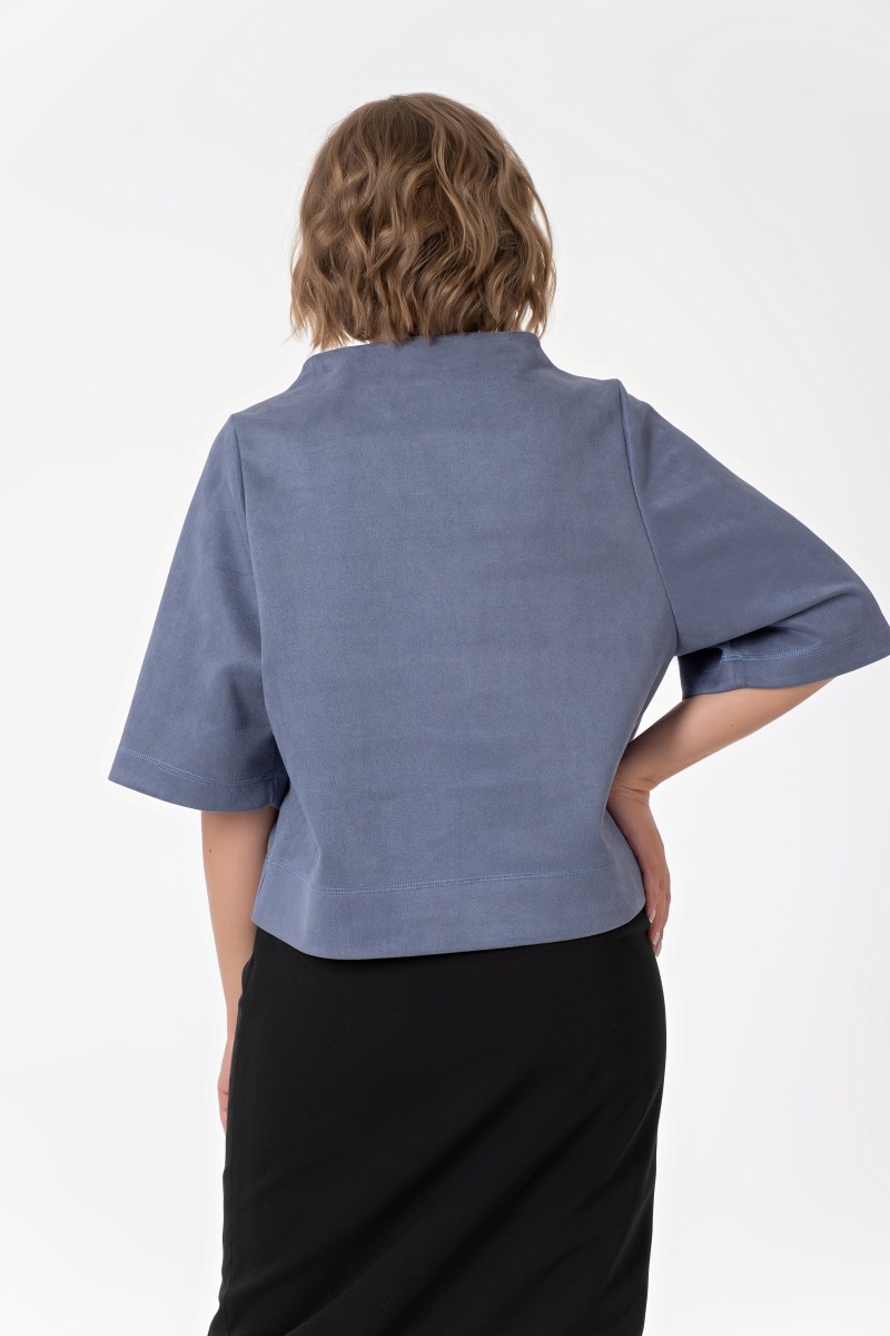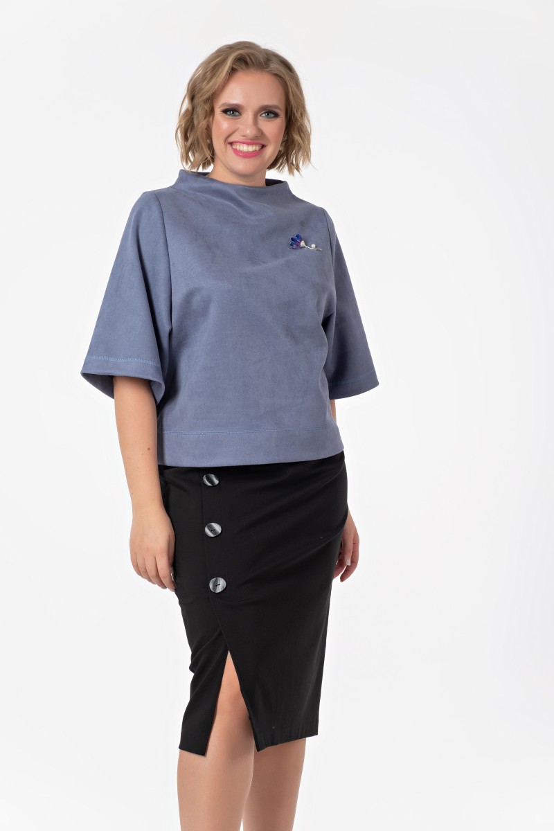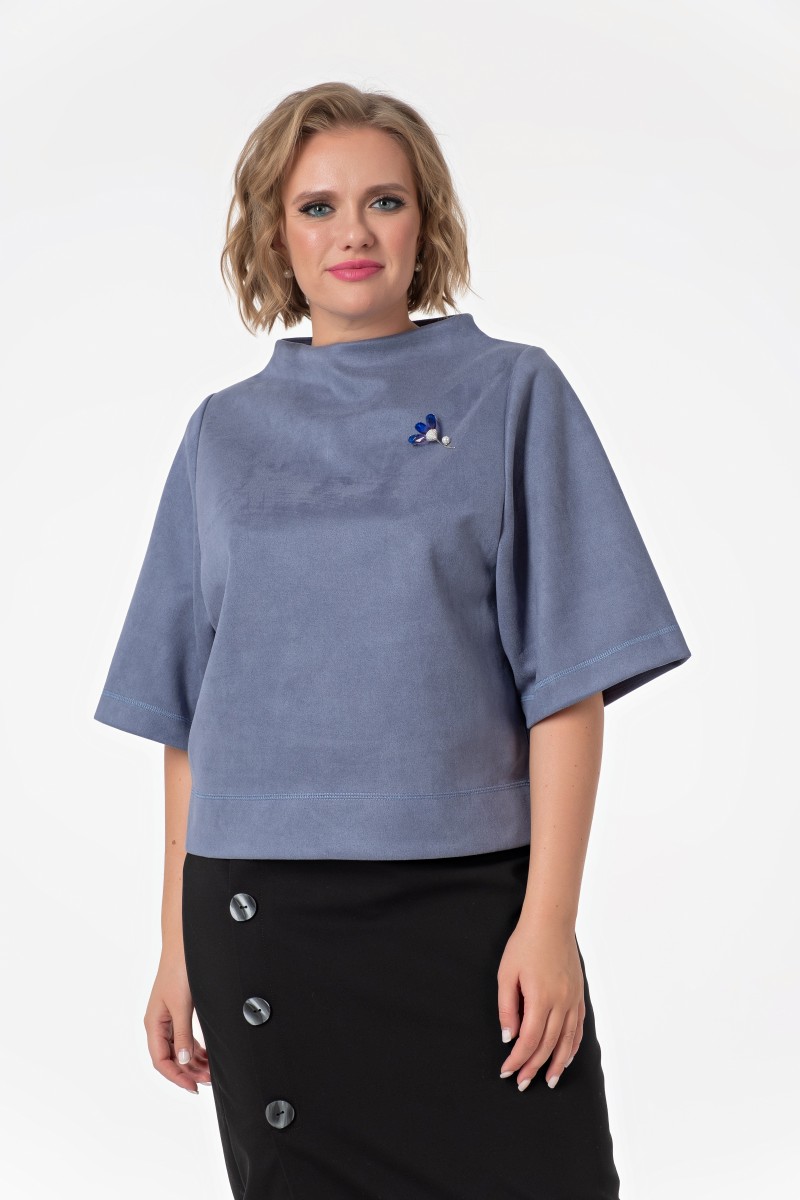 Джемпер – из плотного трикотажного полотна/ прямого силуэта/ длиной выше линии бёдер/ с разрезами в нижней части боковых швов/ с широкими втачными рукавами длиной 3/4/ с цельнокроеным воротником стойкой.