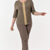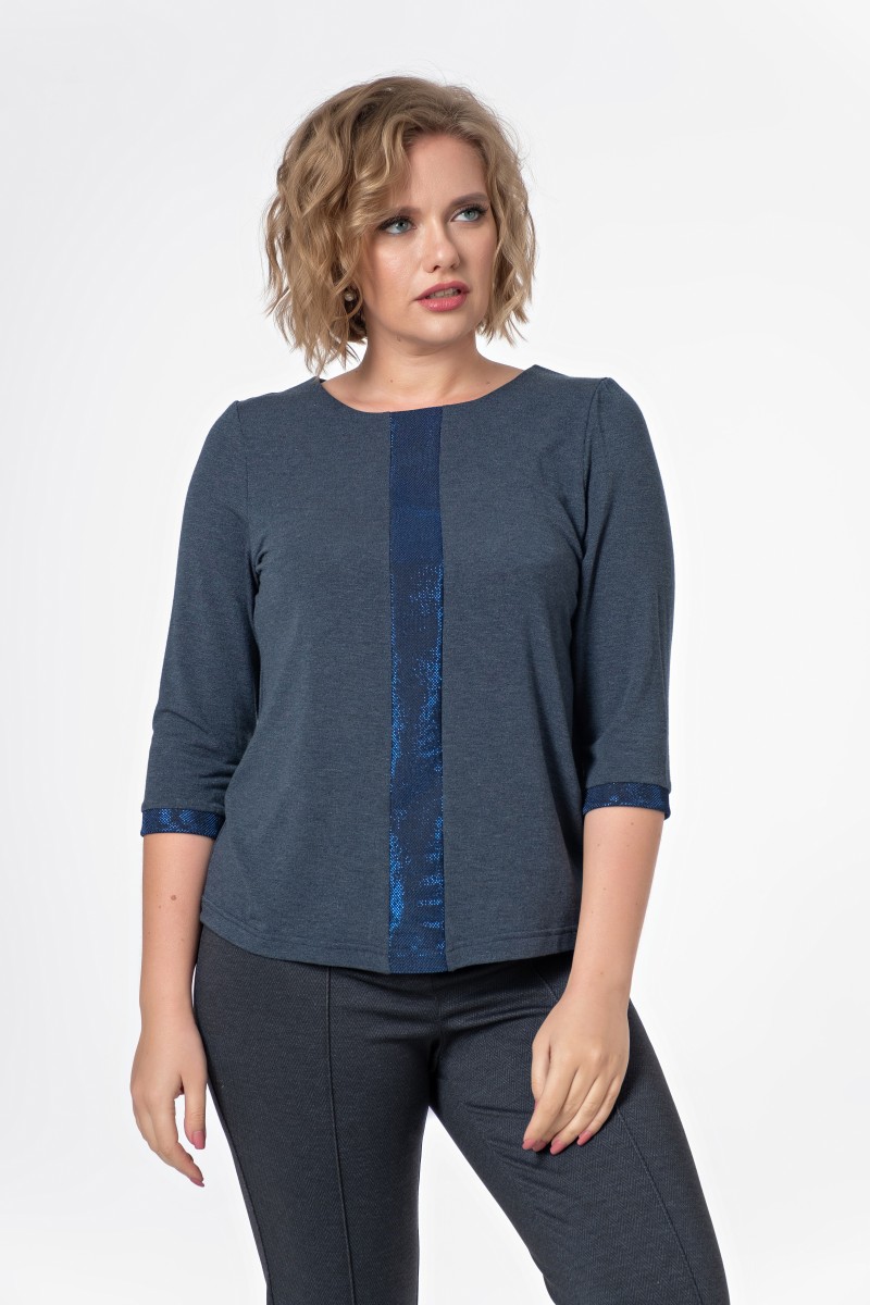 Джемпер женский из трикотажного полотна/ полуприлегающего силуэта/ без воротника с круглым вырезом по горловине переда (горловина обработана обтачкой). Перед с притачной вертикальной вставкой по центру. Рукава втачные длиной 3/4/ с притачными манжетами.