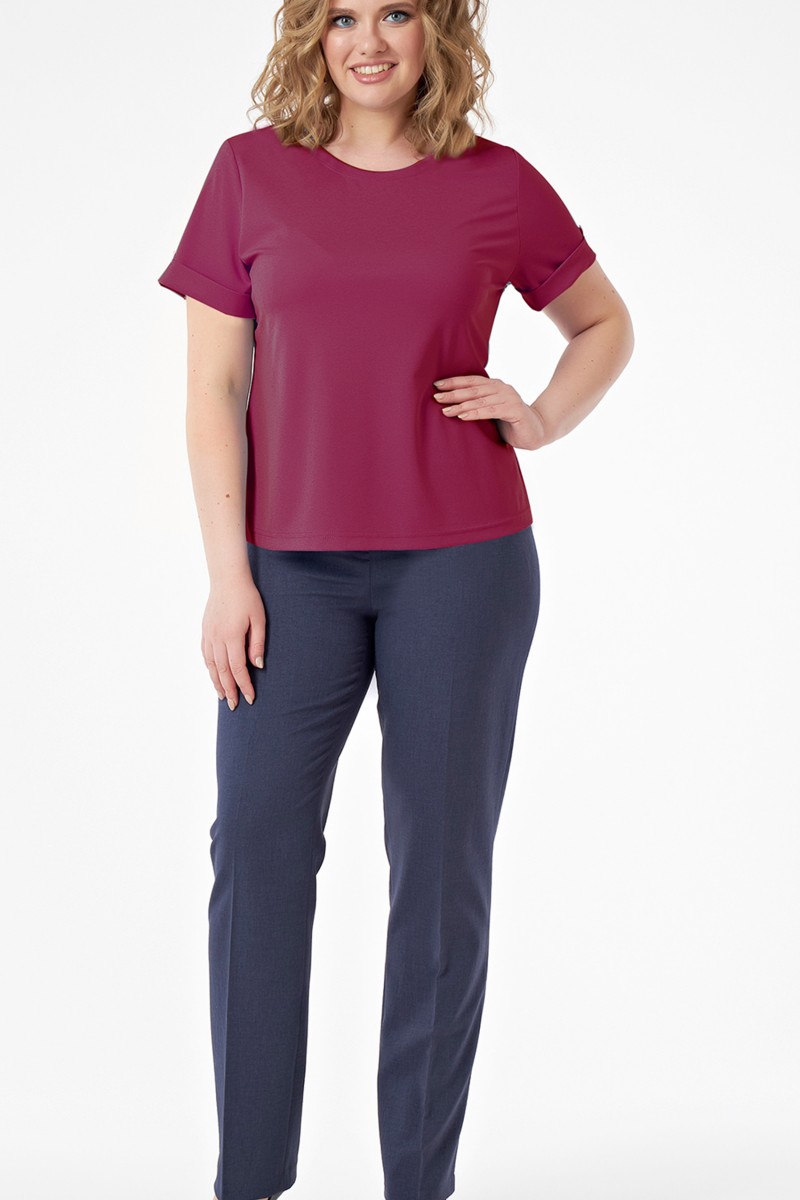 Блузка женская из трикотажного полотна/ прямого силуэта/ без воротника с круглым вырезом по горловине переда обработанным бейкой/ с разрезами в боковых швах. Рукава втачные/ короткие/ с цельнокроеными отложными манжетами по низу.