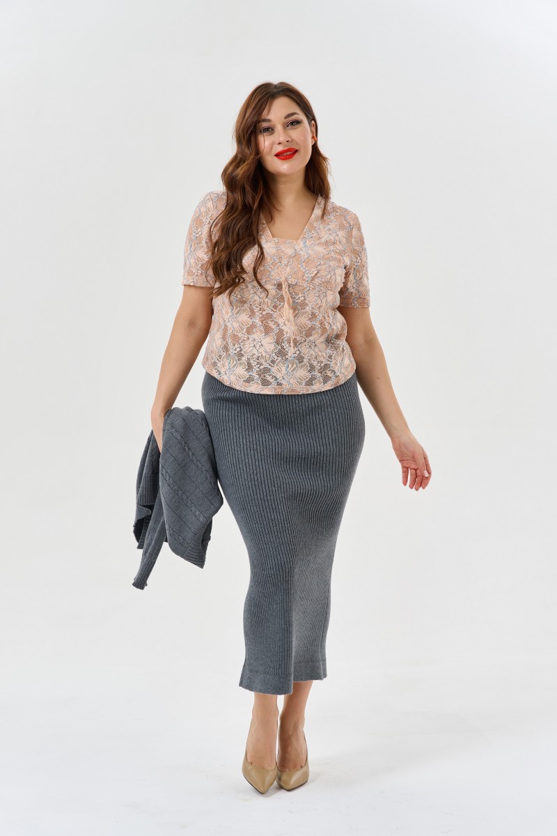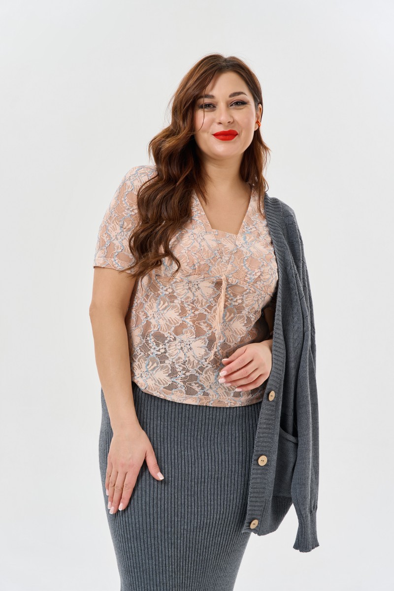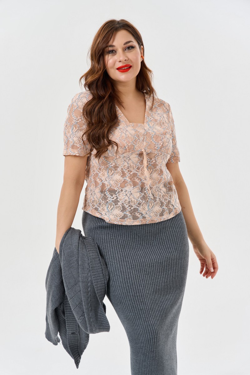 Блузка женская прилегающего силуэта из кружевного полотна. V-образный вырез горловины подрез под грудью. Рукав втачной короткий. Перед частично на подкладе.
