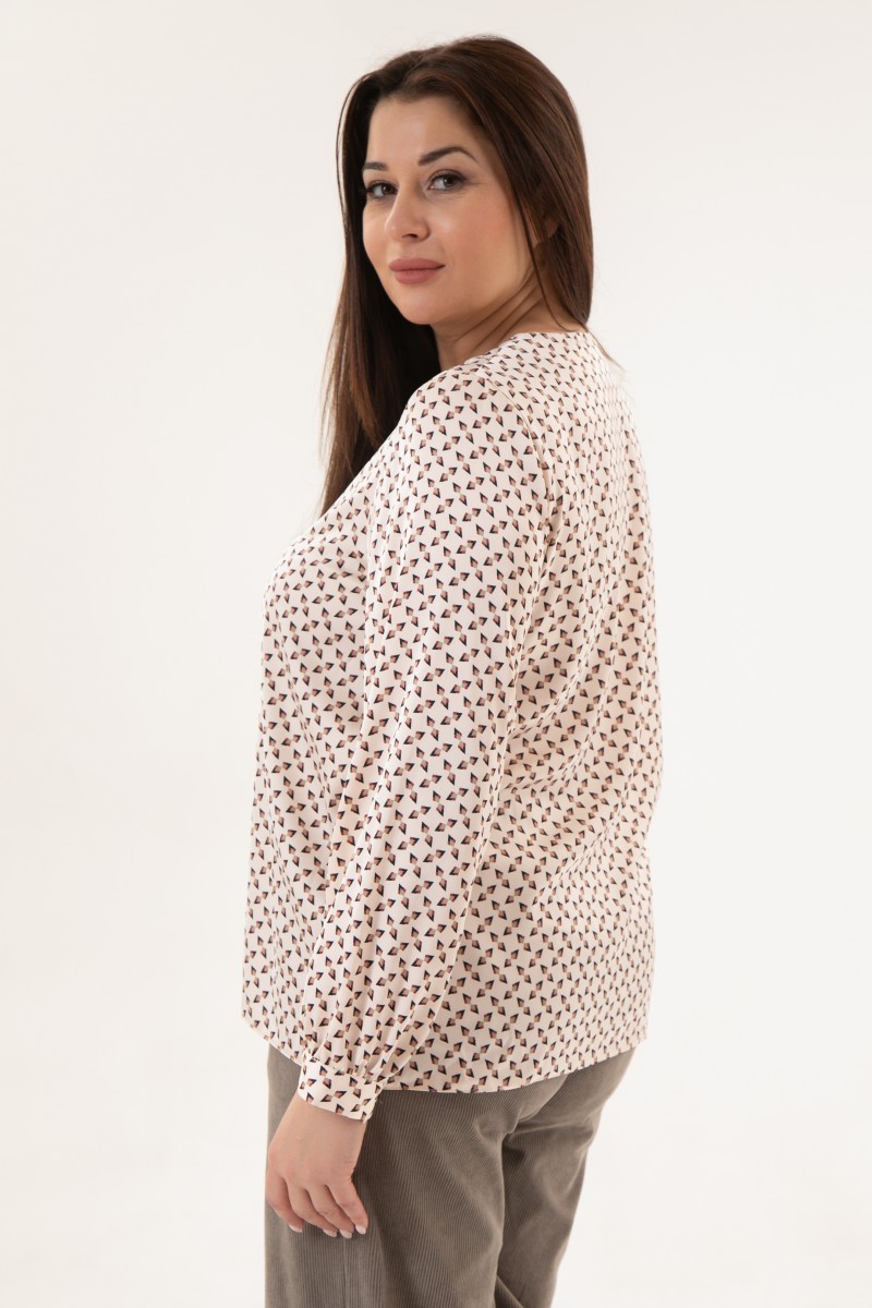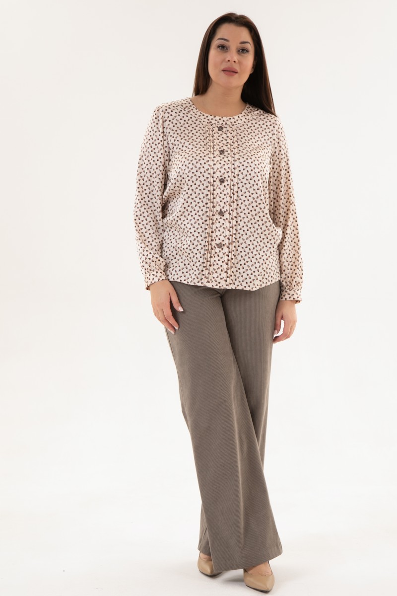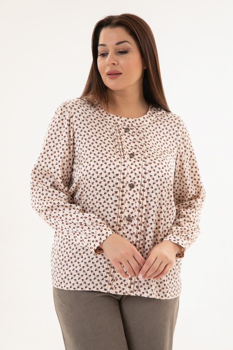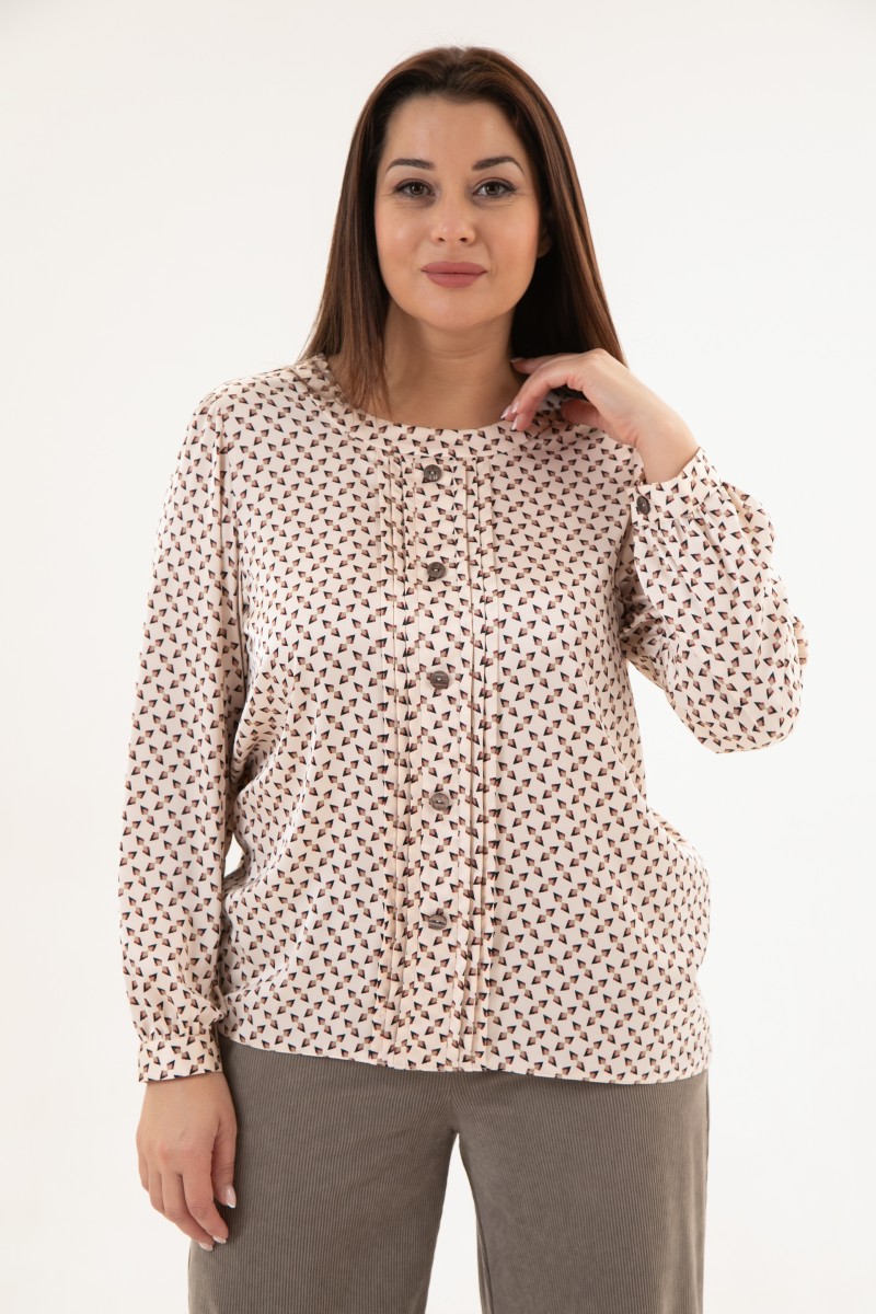 Блузка женская с втачной планкой по переду и группой складок с обеих сторон.На планке пять пуговиц.По горловине переда отделочная бейка.Рукав длинный на манжете.