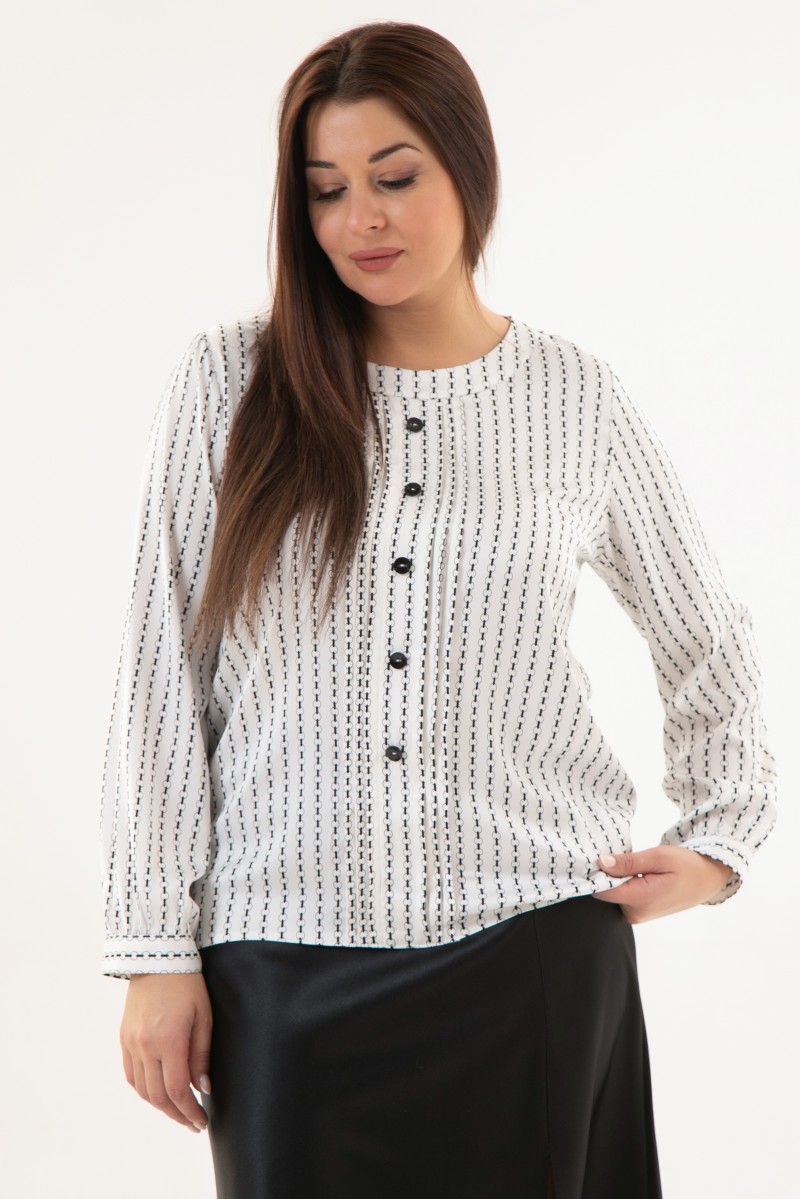 Блузка женская с втачной планкой по переду и группой складок с обеих сторон.На планке пять пуговиц.По горловине переда отделочная бейка.Рукав длинный на манжете.