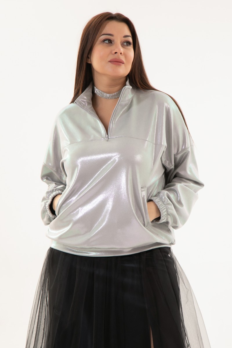 Нарядный свитшот из трикотажа с длинными рукавами и воротником стойкой. По переду кокетка и застежка на молнию до кокетки. Свитшот с функциональными карманами. Низ свитшота на поясе.Размеры сдвоенные 46-48 50-52 54-56 58-60.