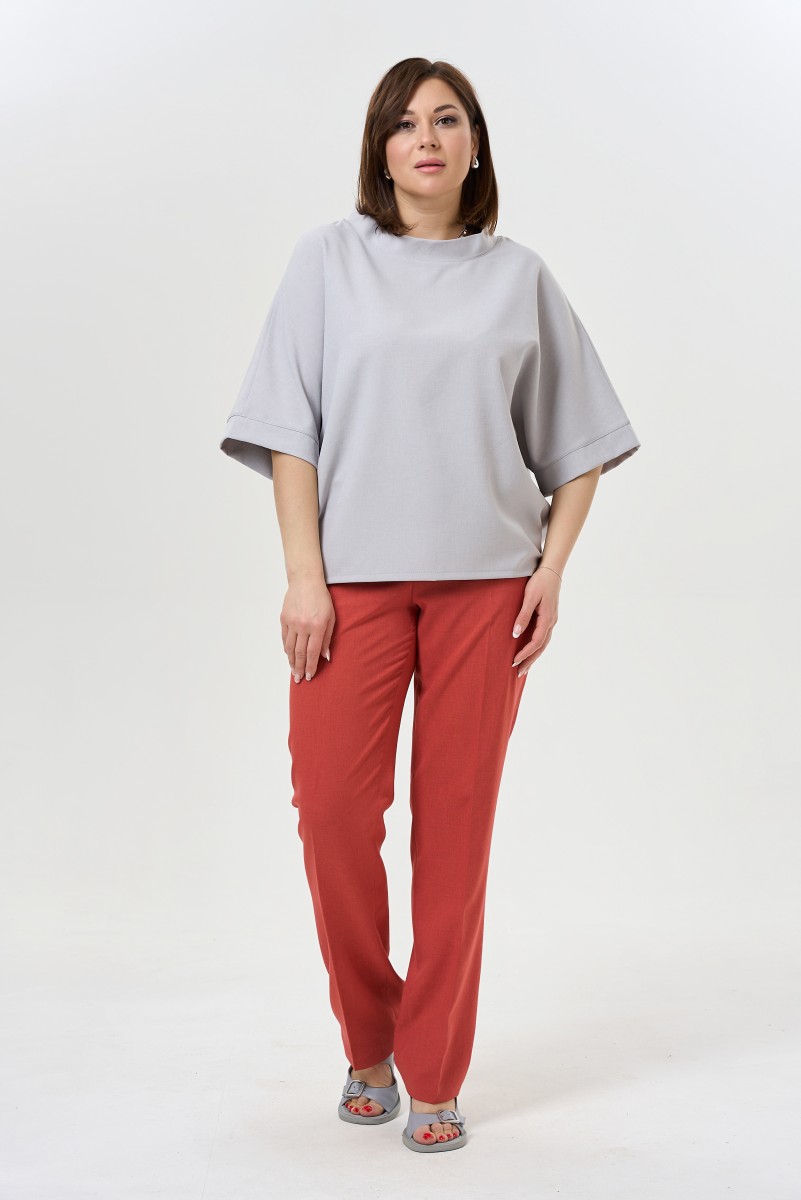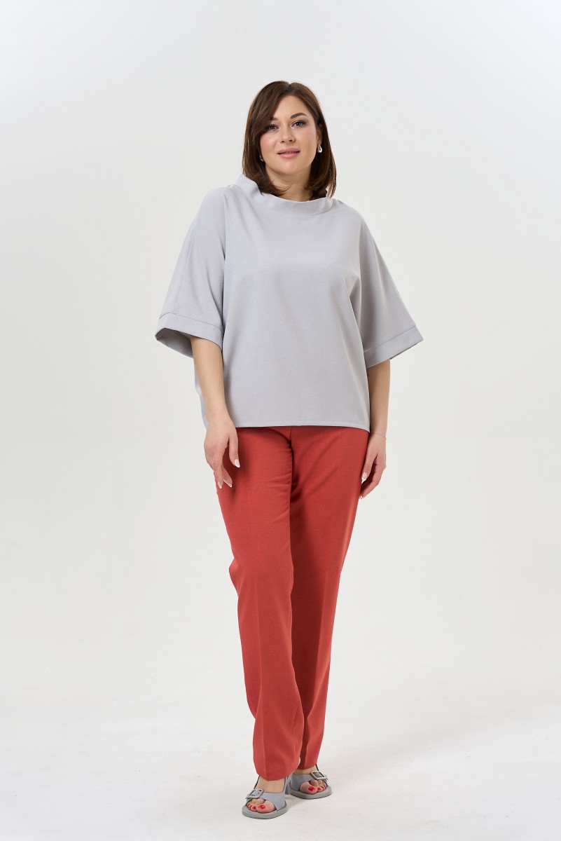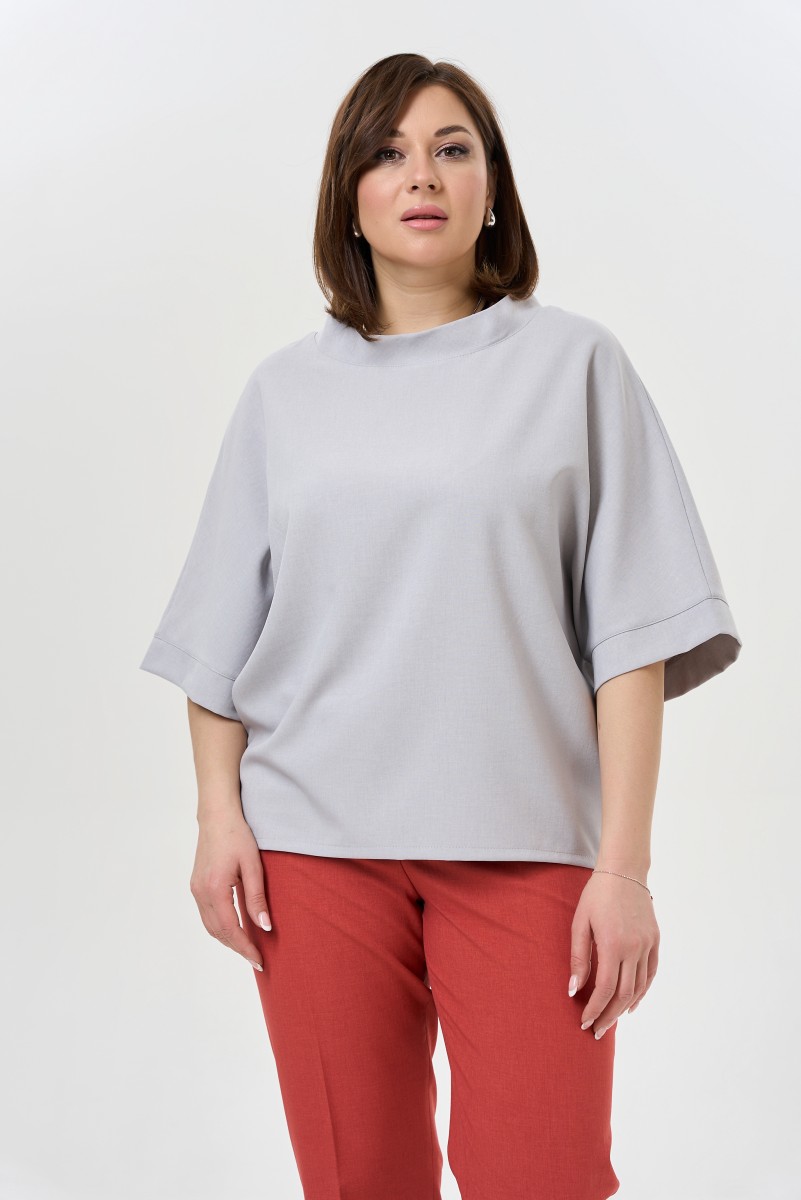 Блузка женская свободного силуэта.Рукава 3/4 цельнокроеные с притачной манжетой. Воротник – стойка. Низ изделия фигурный.