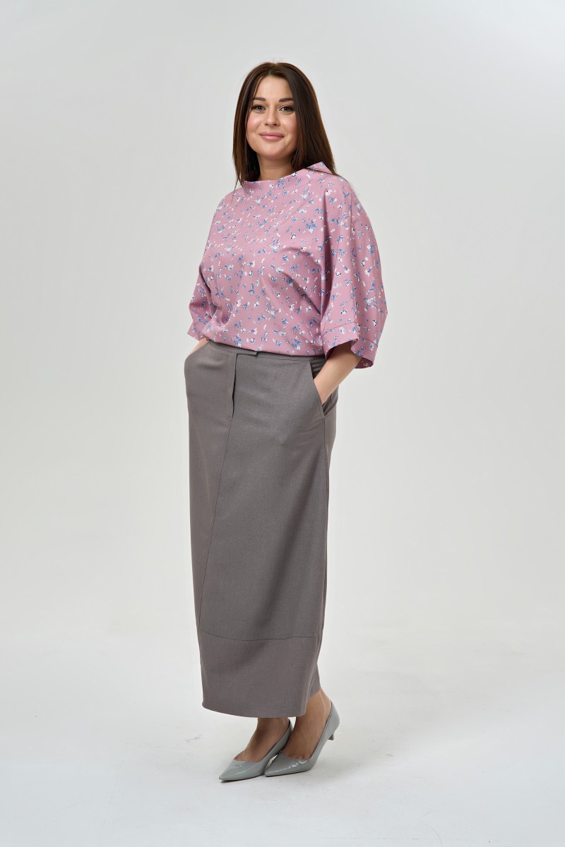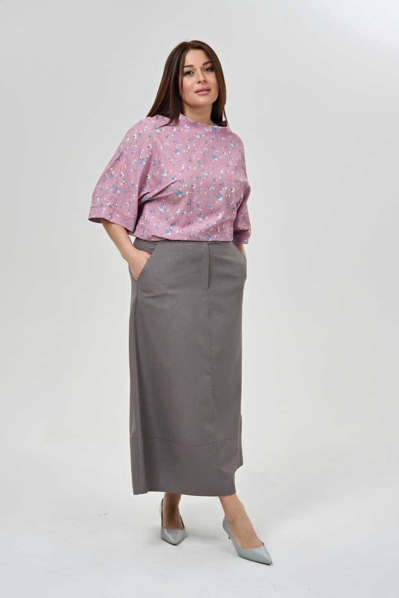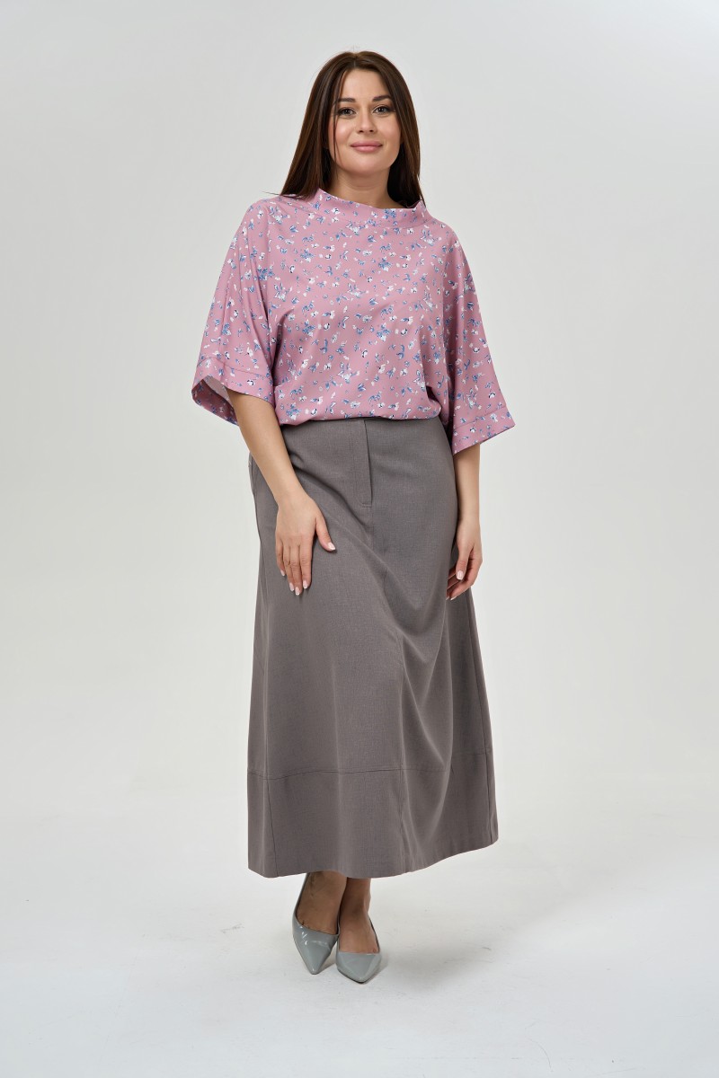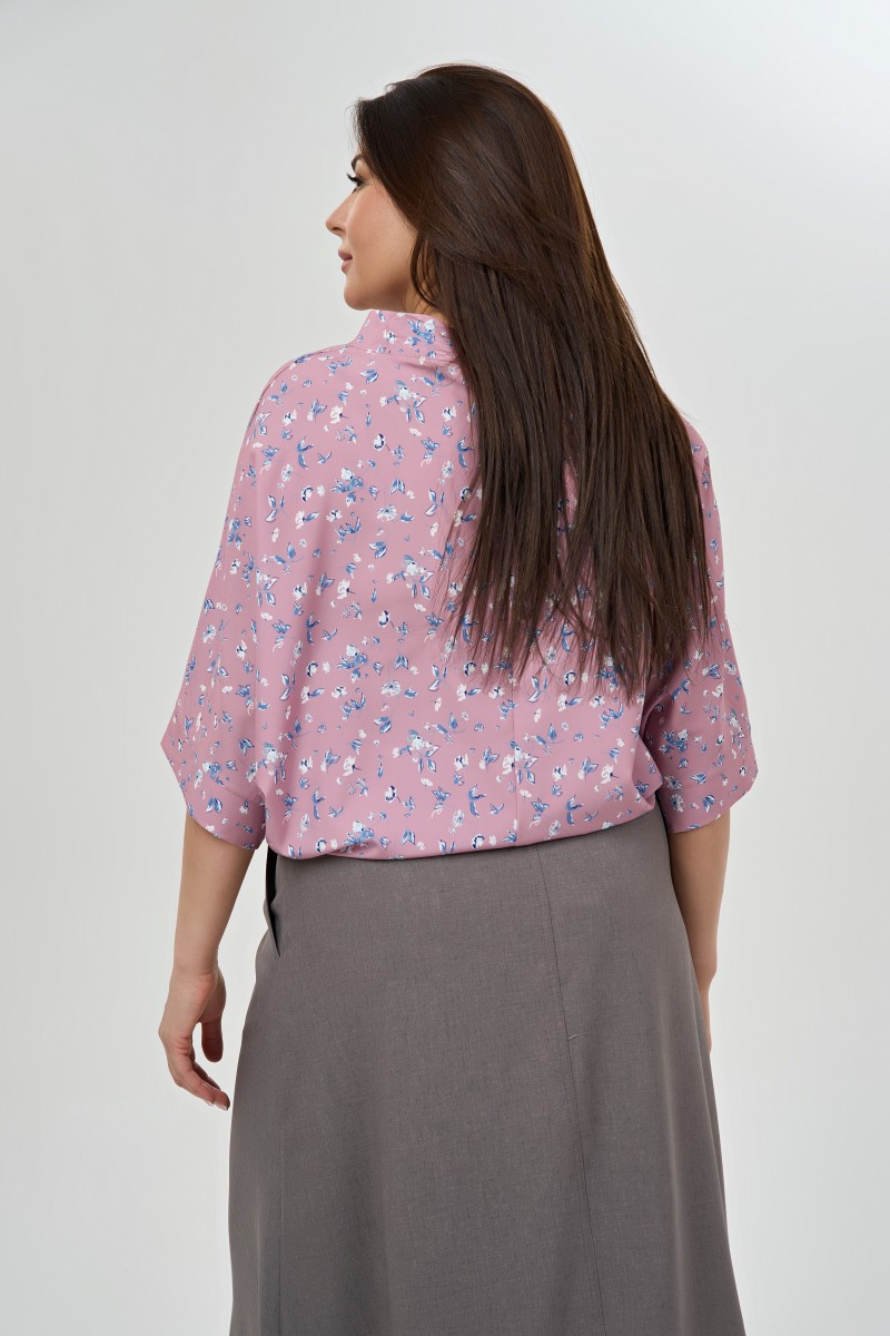 Блузка женская свободного силуэта.Рукава 3/4 цельнокроеные с притачной манжетой. Воротник – стойка. Низ изделия фигурный.