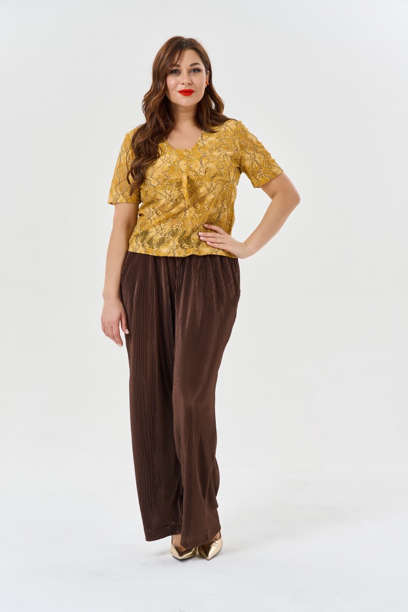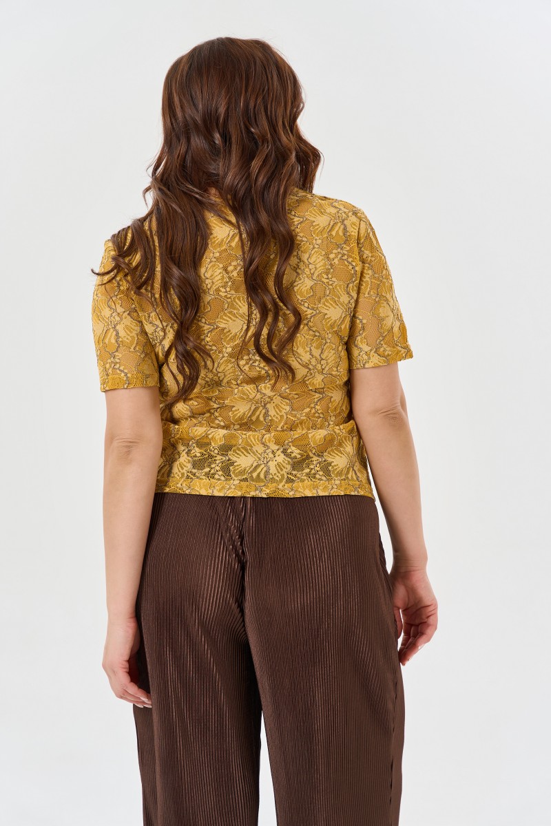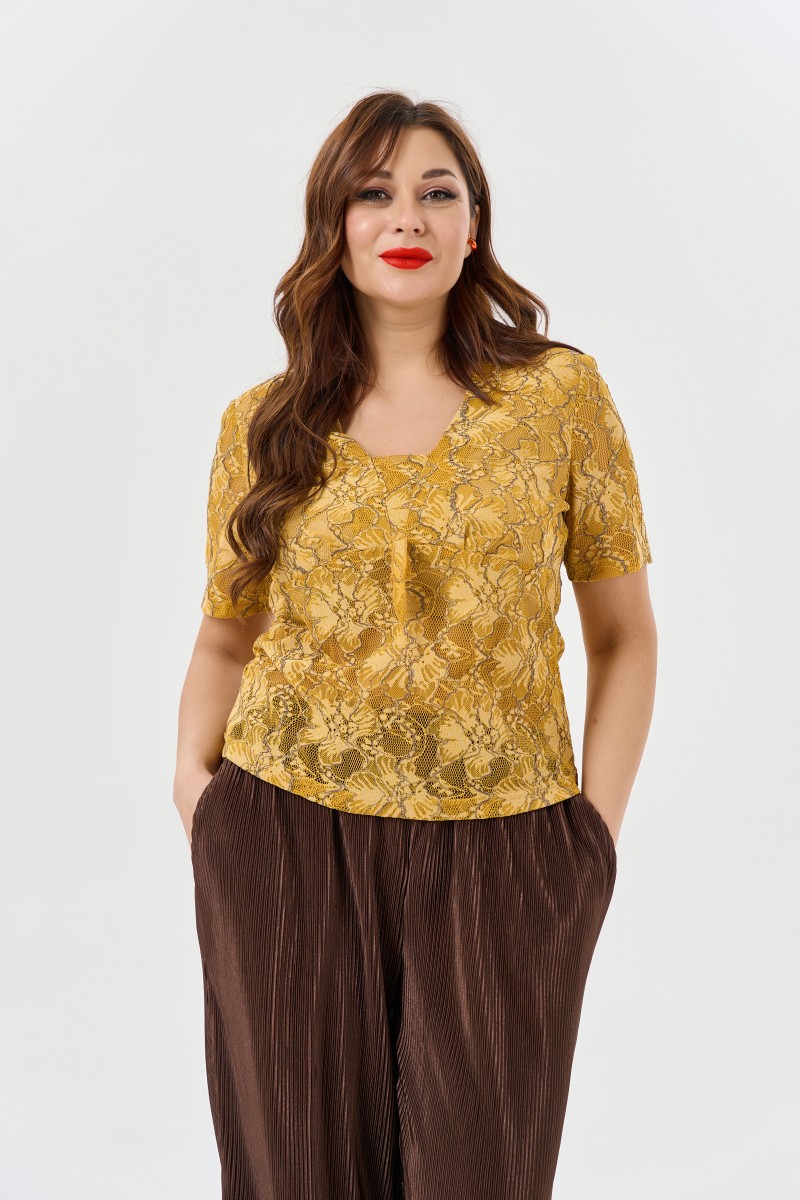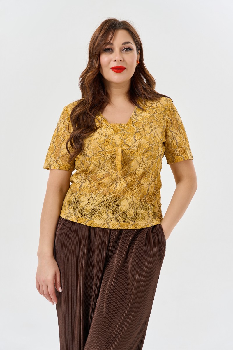 Блузка женская прилегающего силуэта из кружевного полотна. V-образный вырез горловины подрез под грудью. Рукав втачной короткий. Перед частично на подкладе.