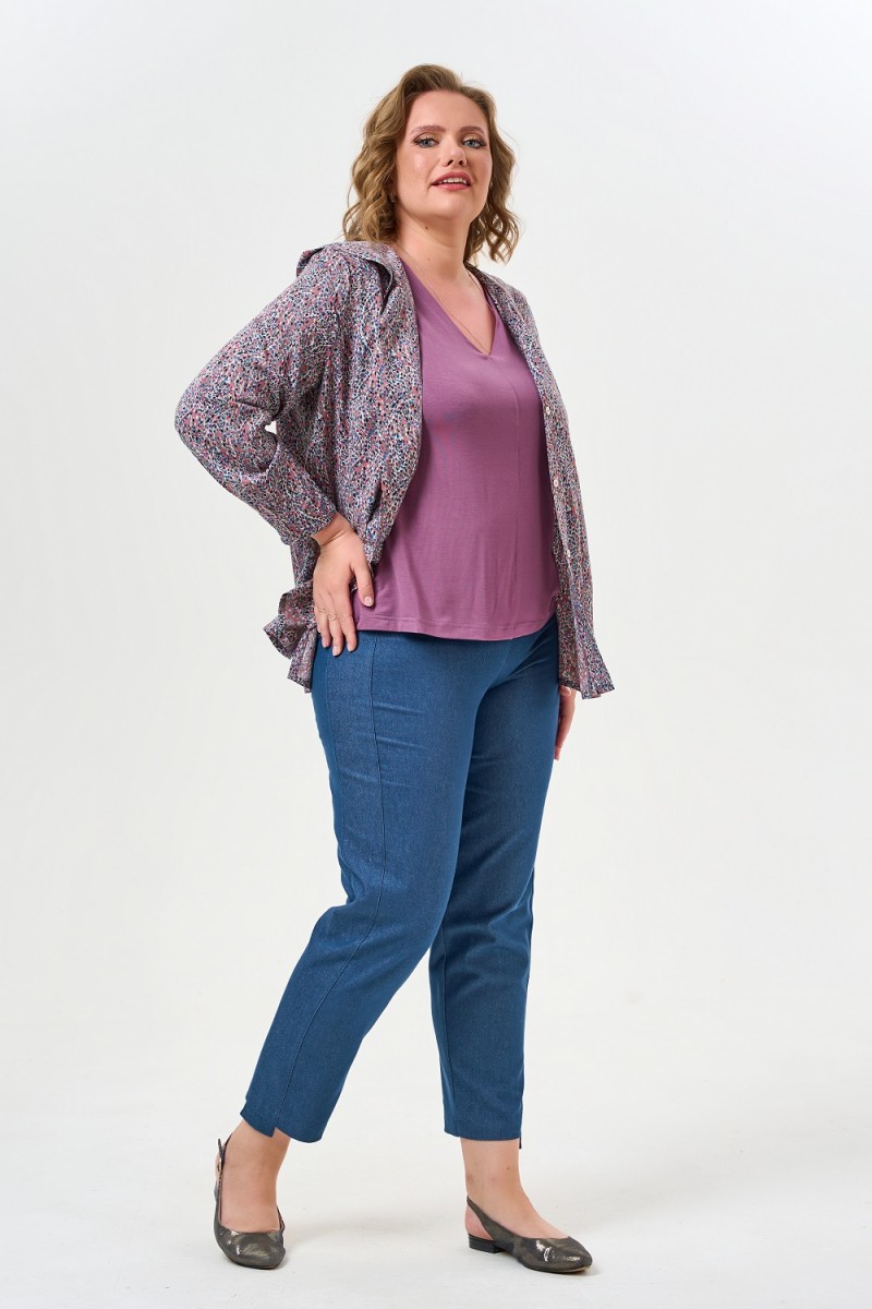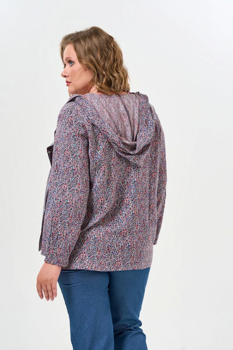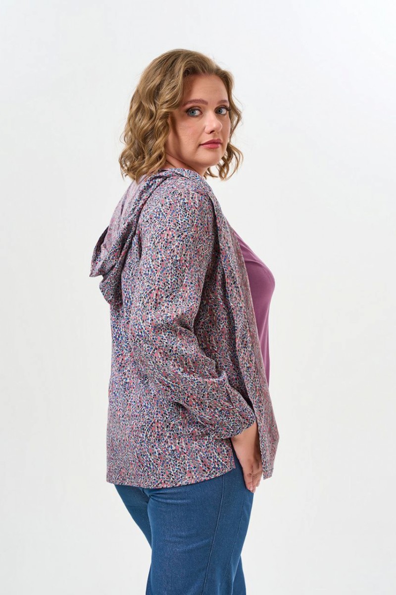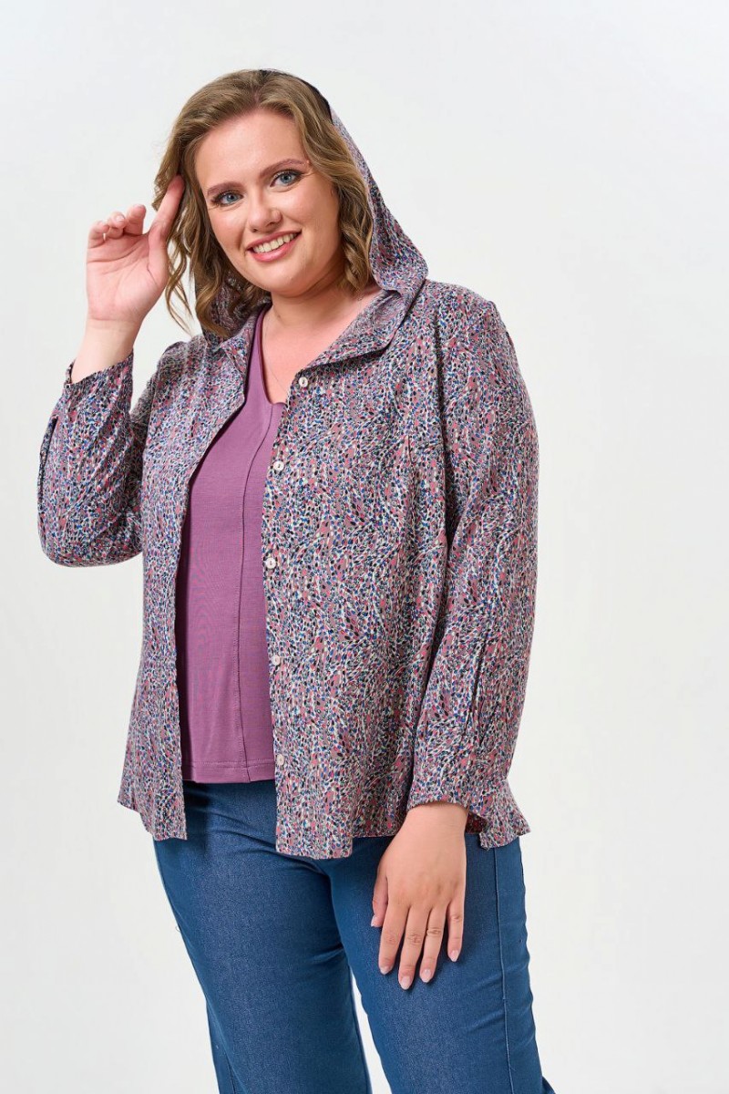 Блузка женская прямого силуэта с капюшоном. По переду грудовые вытачки центральная застежка на петли и пуговицы.Рукава втачные длинные по низу рукава два защипа направленные к центру.