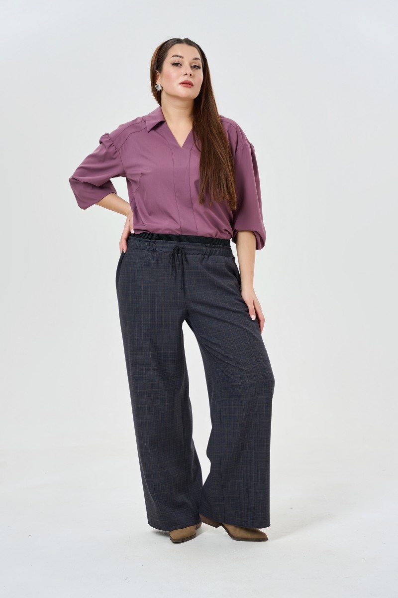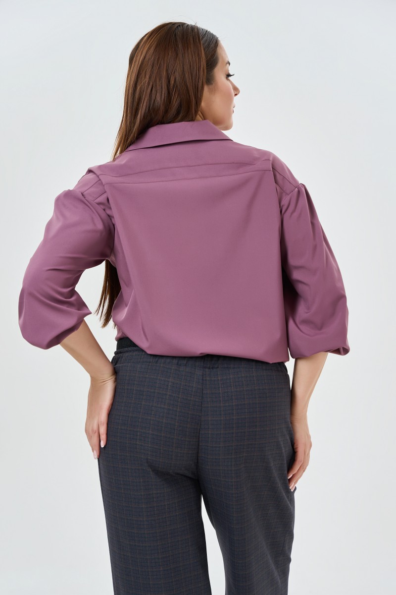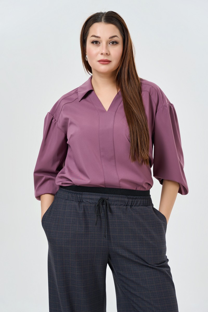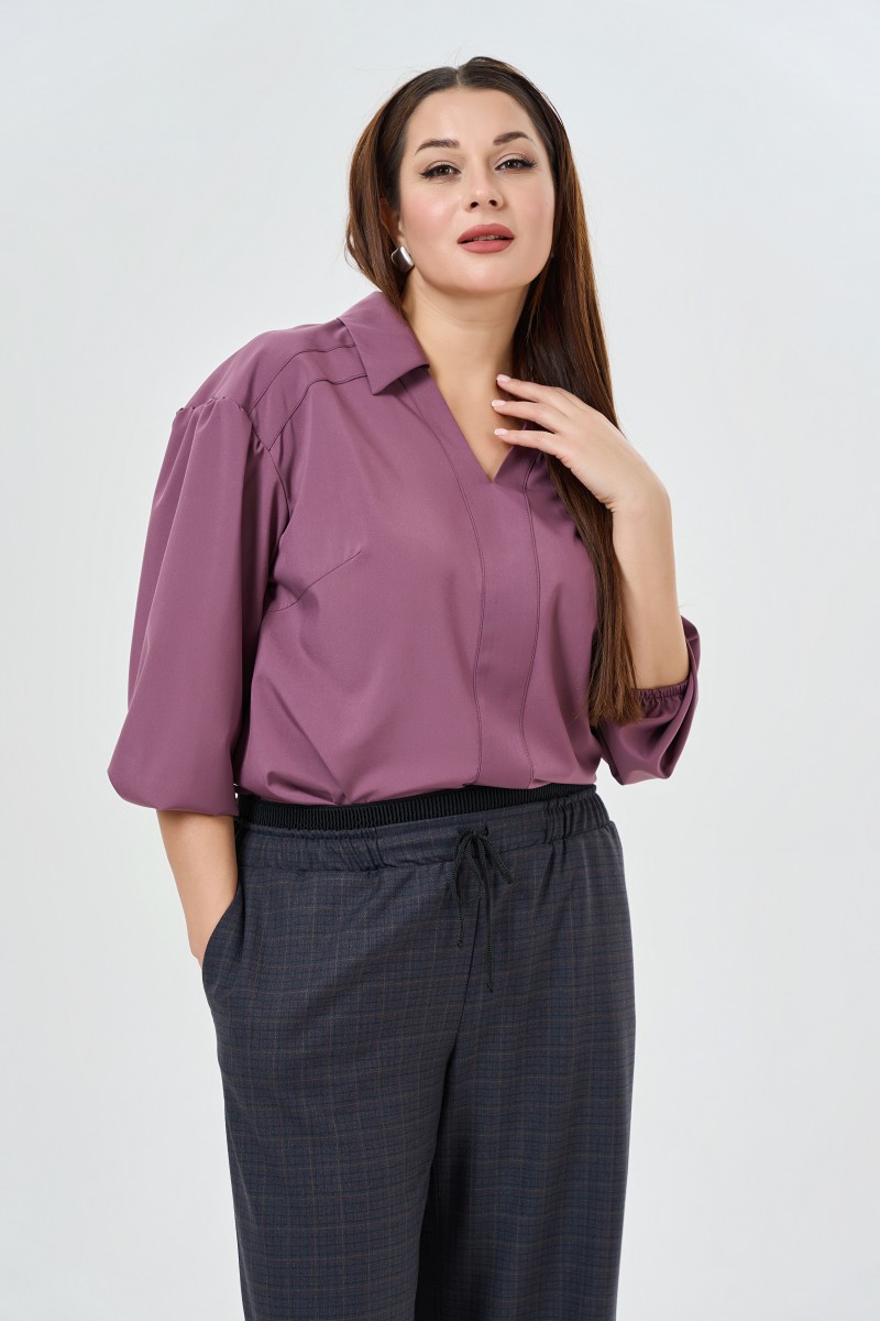 Блузка женская прямого силуэта с V- образным вырезом горловины с отложным воротником с рукавом рубашечного типа длиной 7/8. По низу изделия в боковых швах разрезы. Спинка с двумя кокетками (верхней и нижней).Рукава со сбркой по верхнему срезу низ собран на резинку.