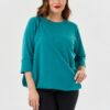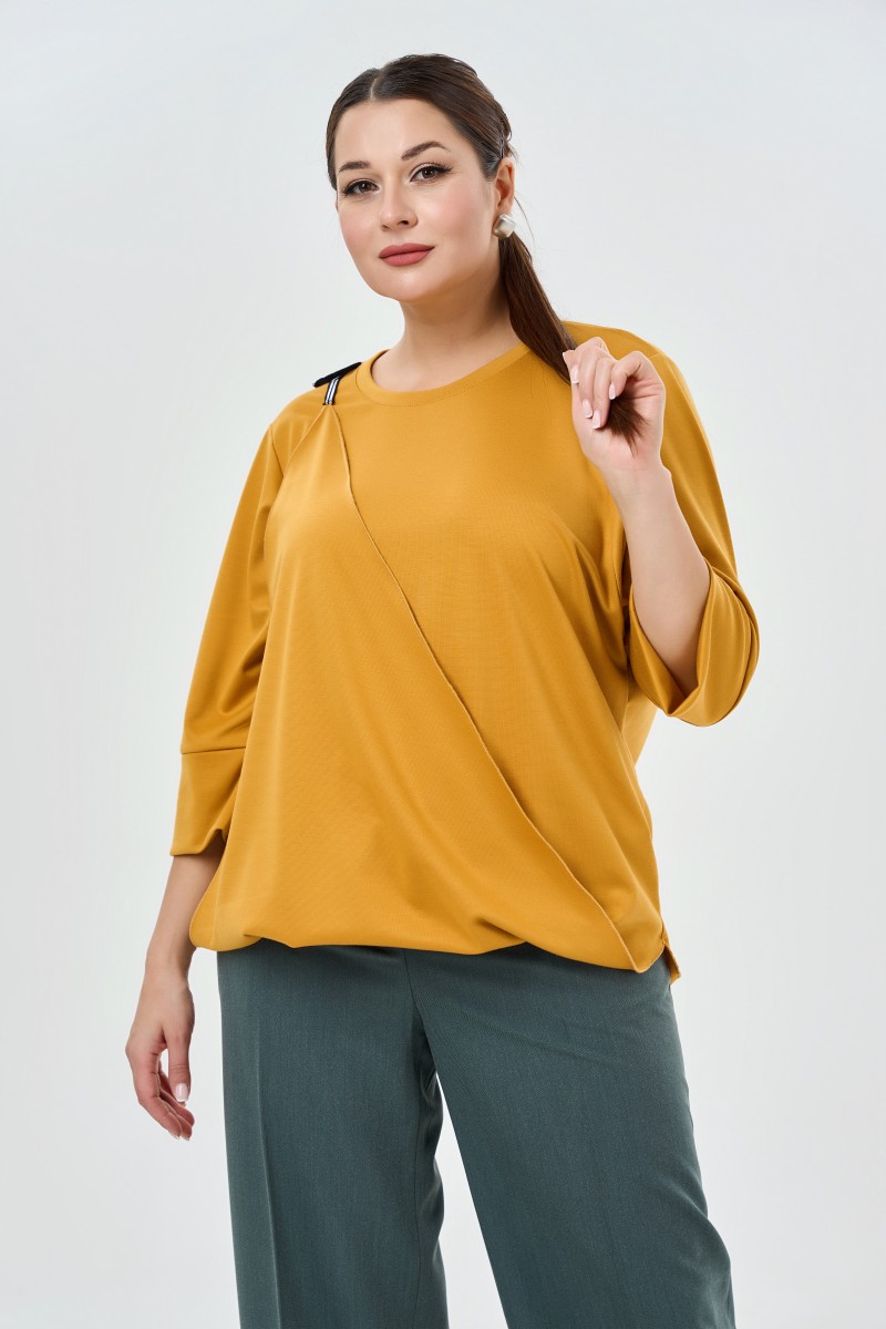 Блузка женская свободного силуэта. Рукава отрезные цельновыкроеные 3/4 с притачной манжетой.Горловина круглая обработана бейкой.Низ изделия фигурный. Правый боковой шов удлинен относительно левого бокового шва.По правому боковому шву разрез. Концы по низу разреза соеденены лямкой ( декоративная резиновая тесьма) что позволяет одеть нижнию правую часть изделия на правое плечо.