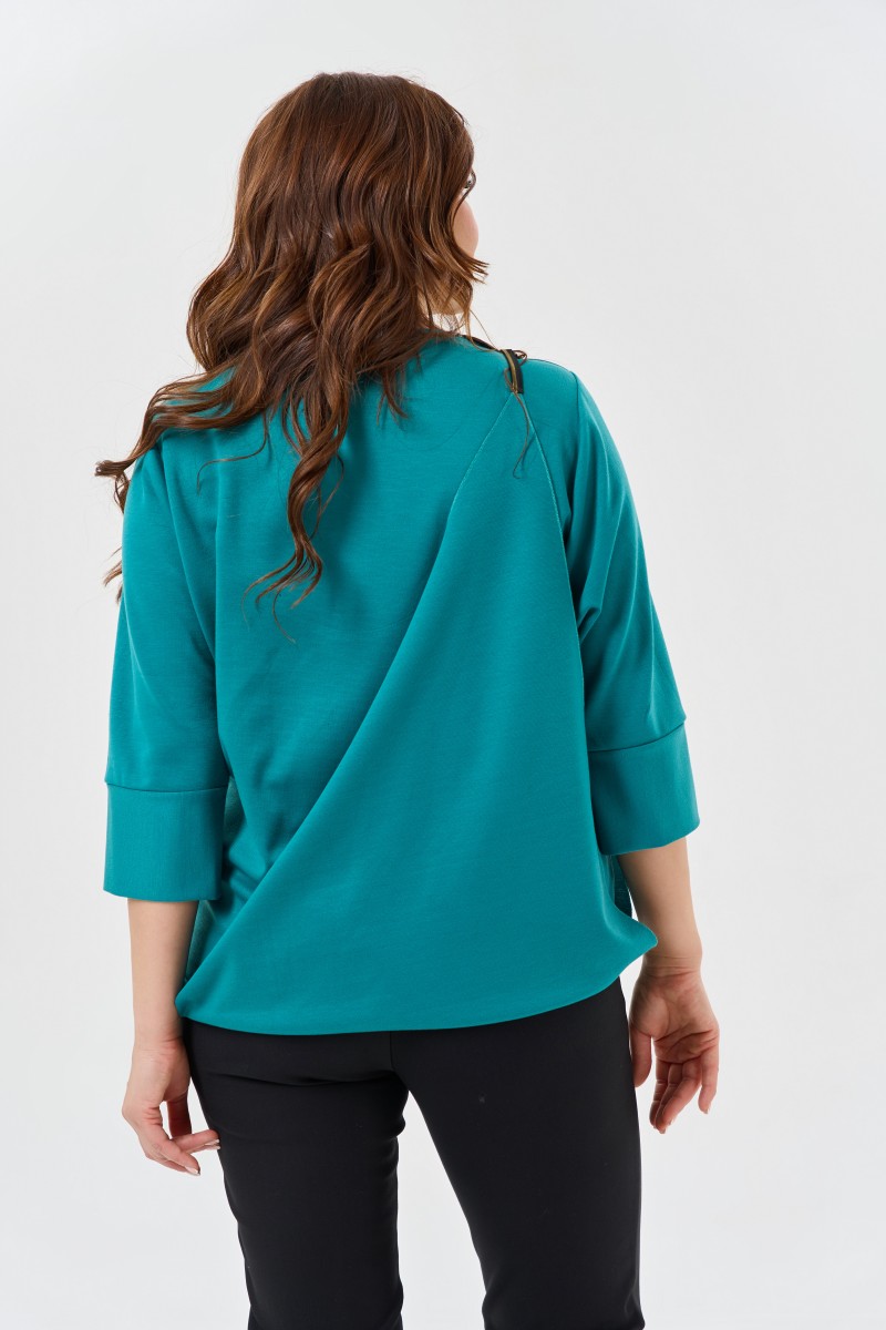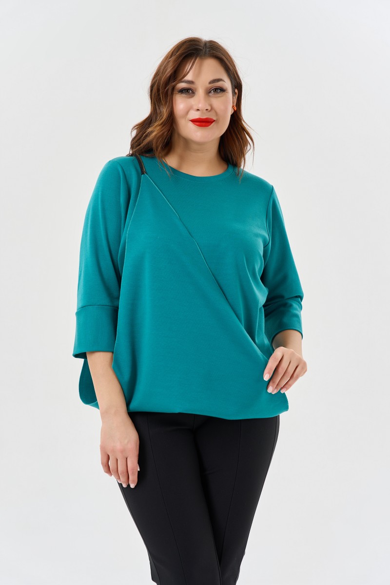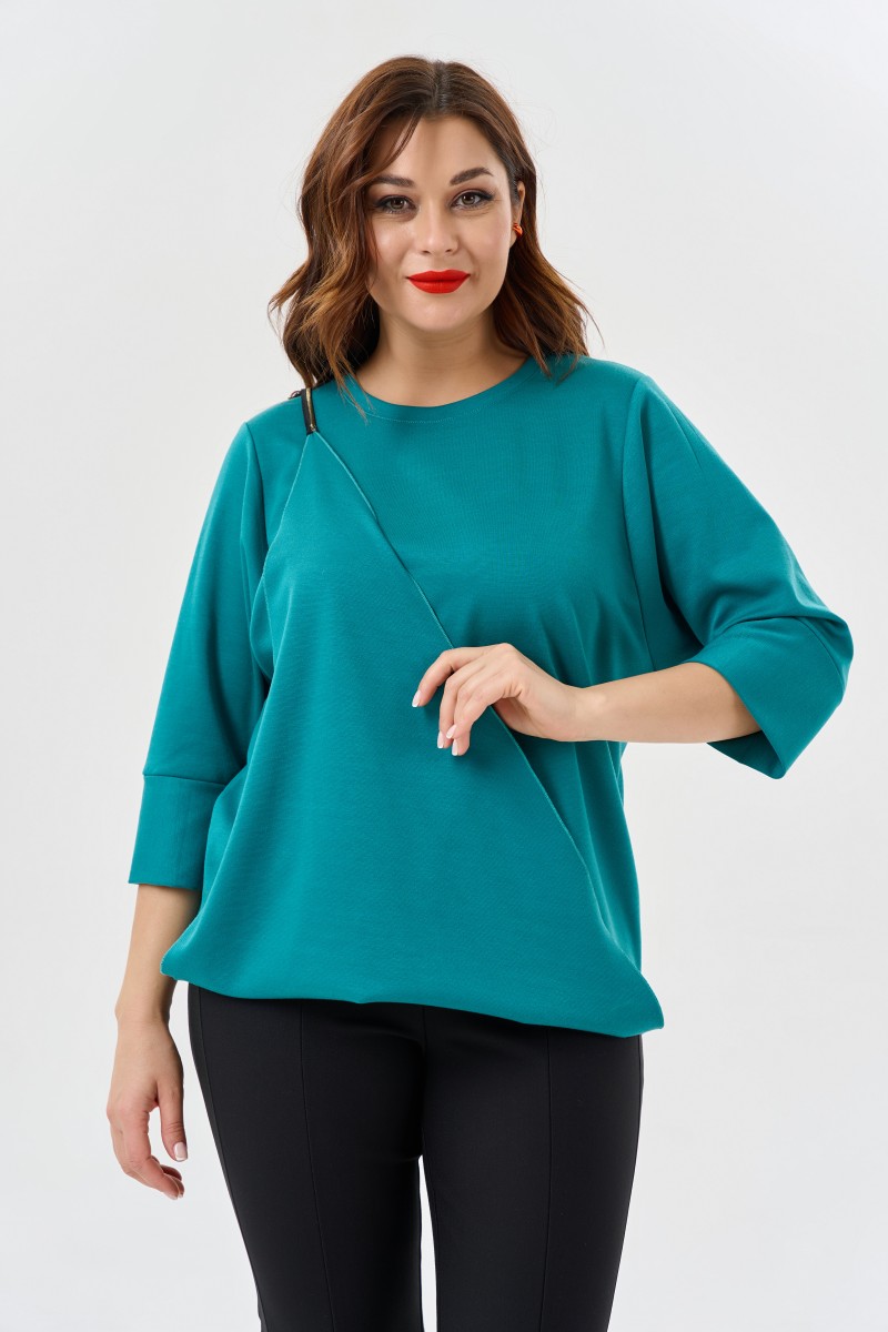 Блузка женская свободного силуэта. Рукава отрезные цельновыкроеные 3/4 с притачной манжетой.Горловина круглая обработана бейкой.Низ изделия фигурный. Правый боковой шов удлинен относительно левого бокового шва.По правому боковому шву разрез. Концы по низу разреза соеденены лямкой ( декоративная резиновая тесьма) что позволяет одеть нижнию правую часть изделия на правое плечо.