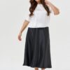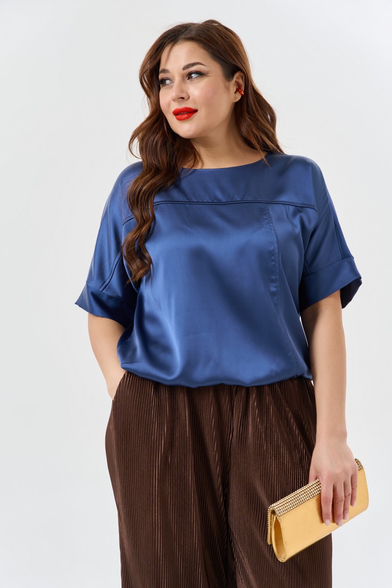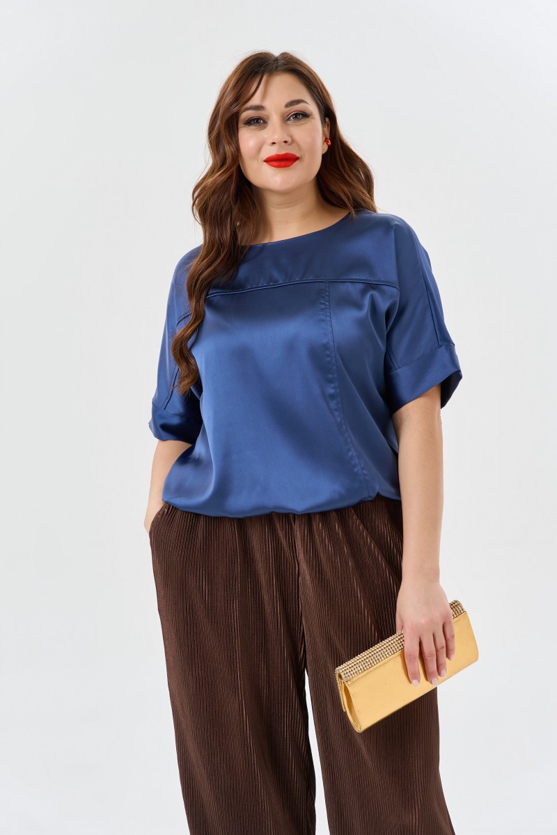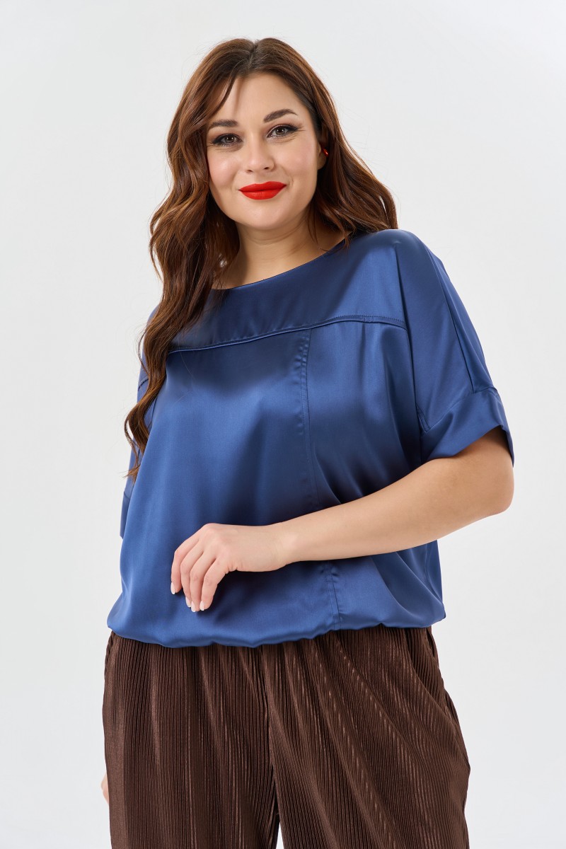 Блузка женская свободной формы. Рукава цельнокроеные короткие с притачными манжетами. Горловина круглой формы. По переду два рельефа: горизонтальный (от проймы до проймы) и вертикальный. Низ изделия ровный собран на резинку.