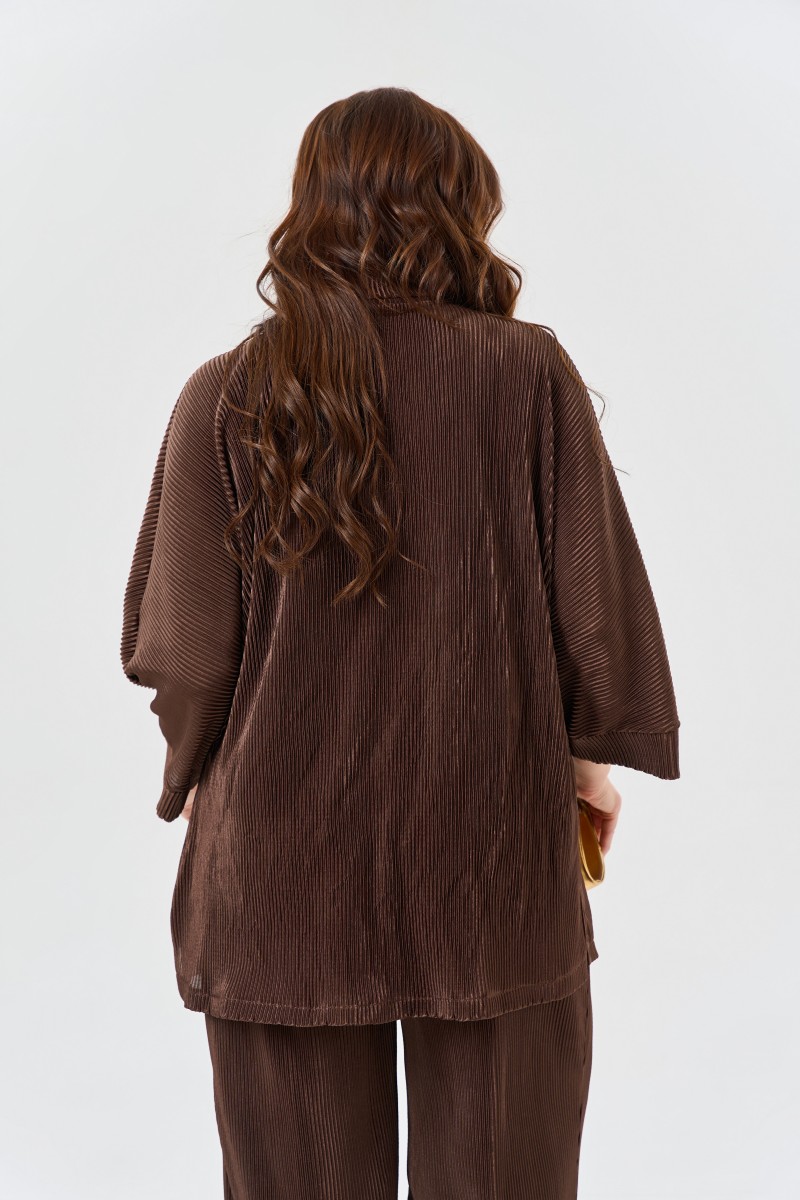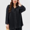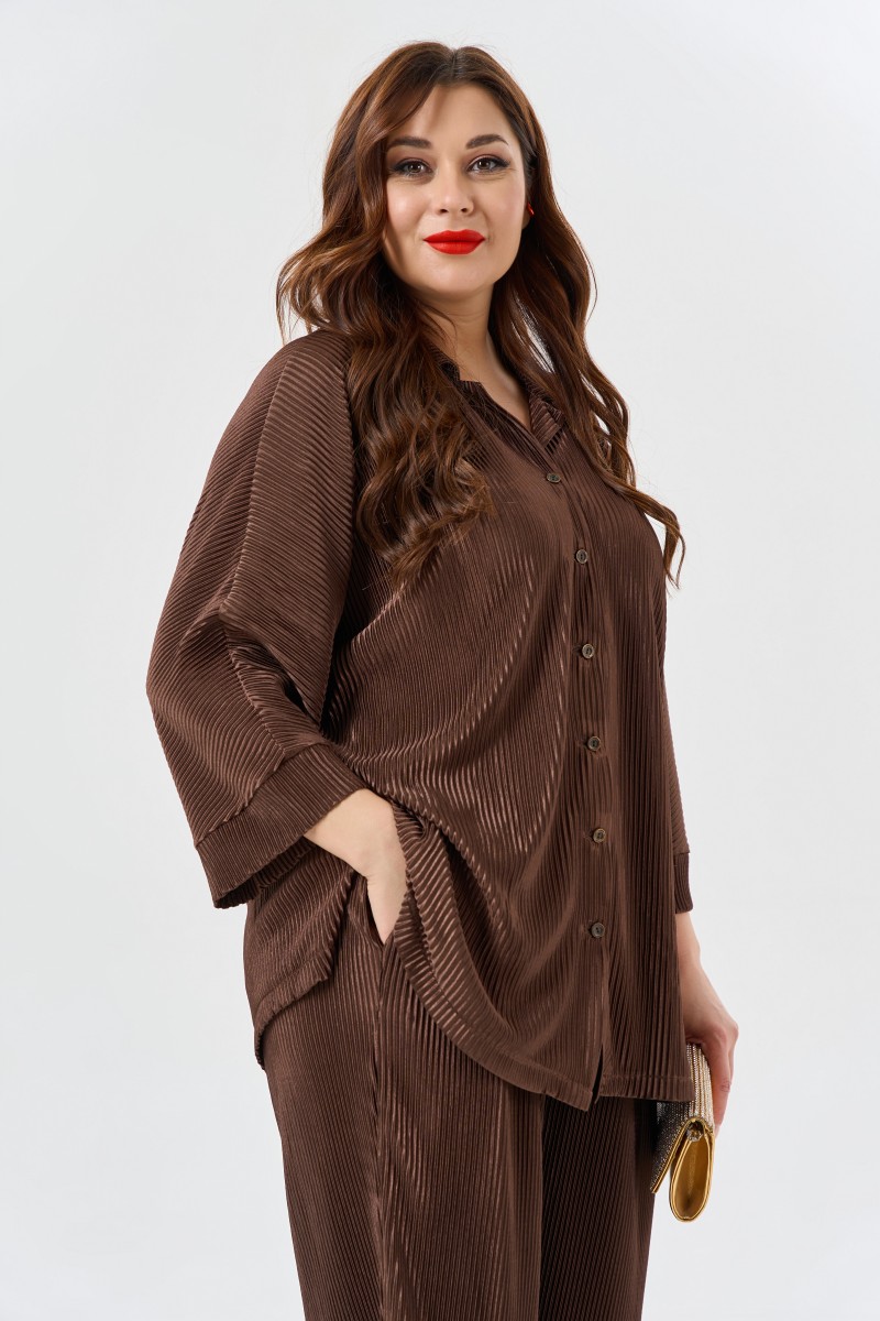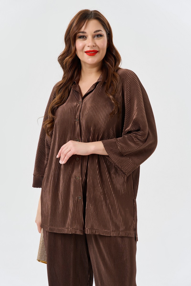 Блузка женская прямого силуэта с длинными рукавами. По переду центральная застежка на петли и пуговицы. Воротник с лацканом пиджачного типа. По боковым швам разрезы. Перед короче спинки.Блузка оверсайз в двух размерах 46-50 и 52-56. Можно сочетать с брюками из такой же ткани модель брюк 0152-823 размеры 46-50 и 52-56