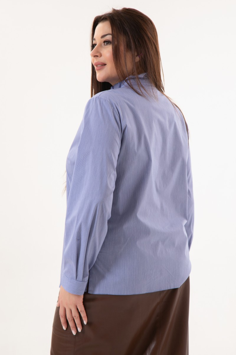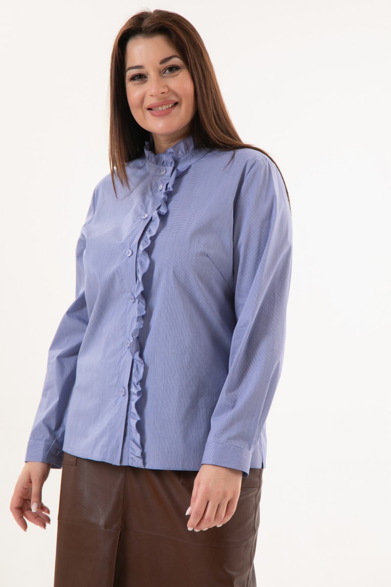 Блузка женская из хлопка с вытачками по переду.На левой полочке планка с втачанной оборкой.Воротник стойка с оборкой. Рукав длинный по низу с защипами и притачной манжетой застегивающейся на пуговицу.Застежка на петли и пуговицы.