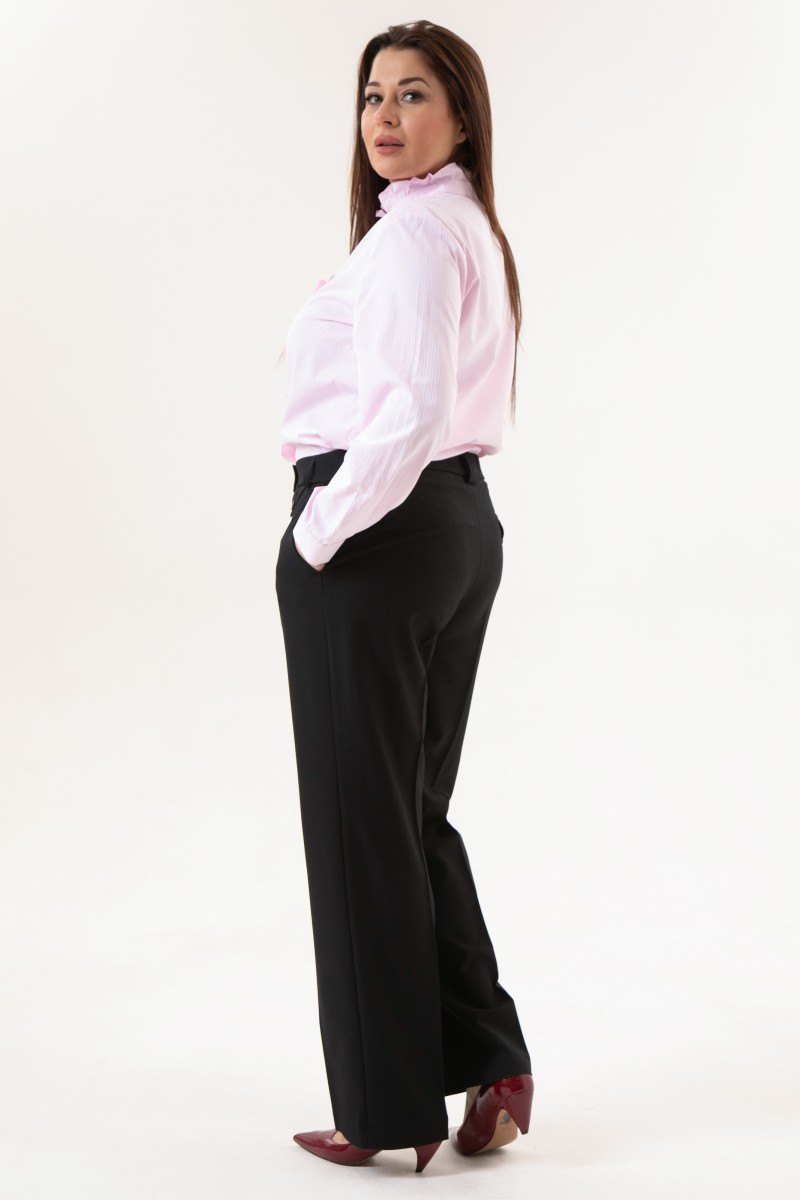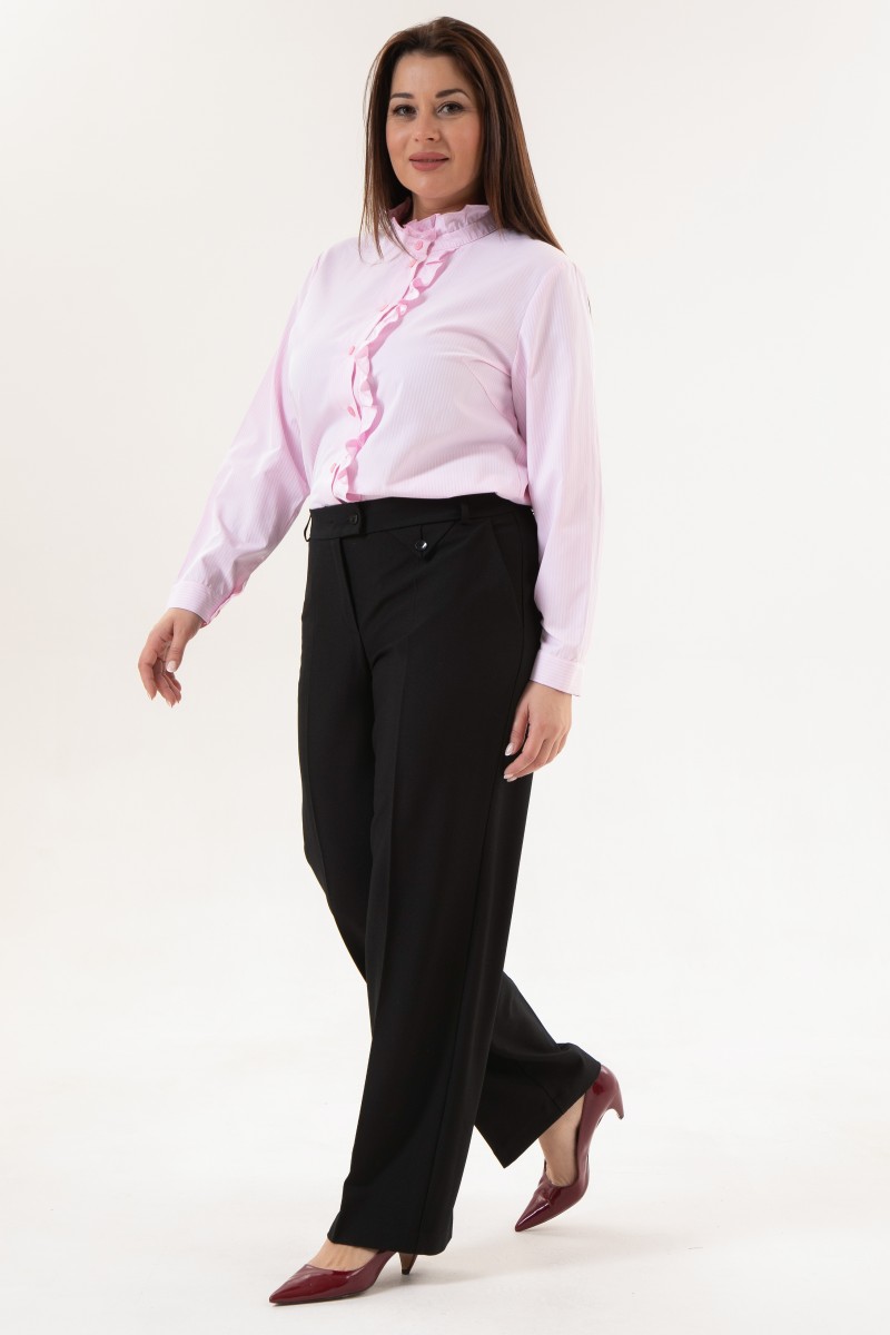 Блузка женская из хлопка с вытачками по переду.На левой полочке планка с втачанной оборкой.Воротник стойка с оборкой. Рукав длинный по низу с защипами и притачной манжетой застегивающейся на пуговицу.Застежка на петли и пуговицы.