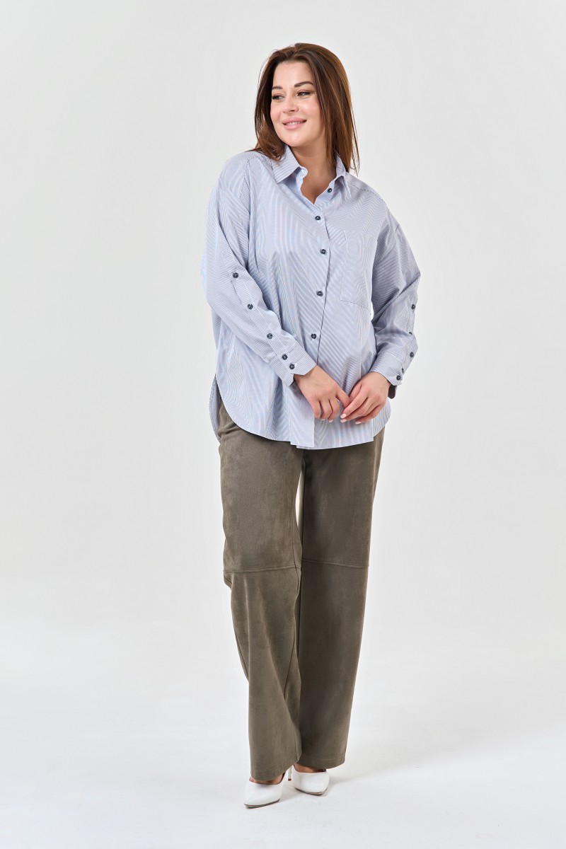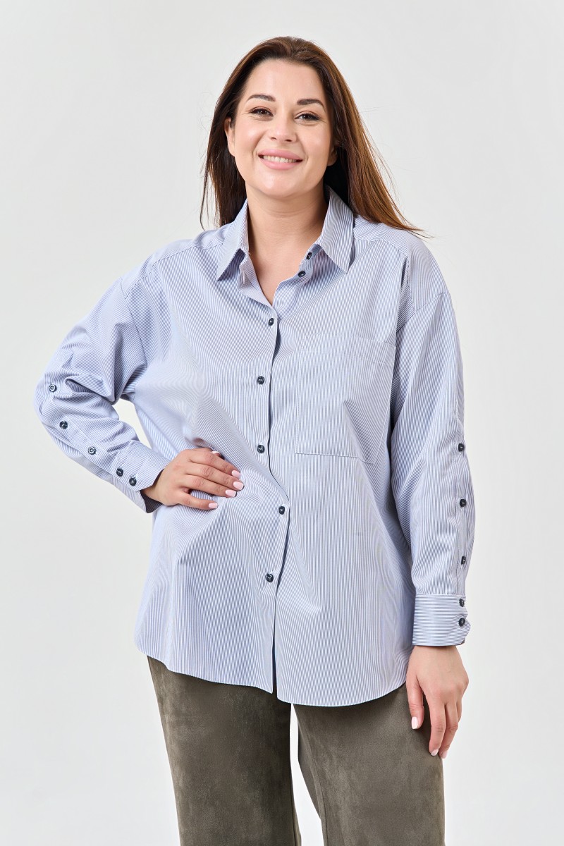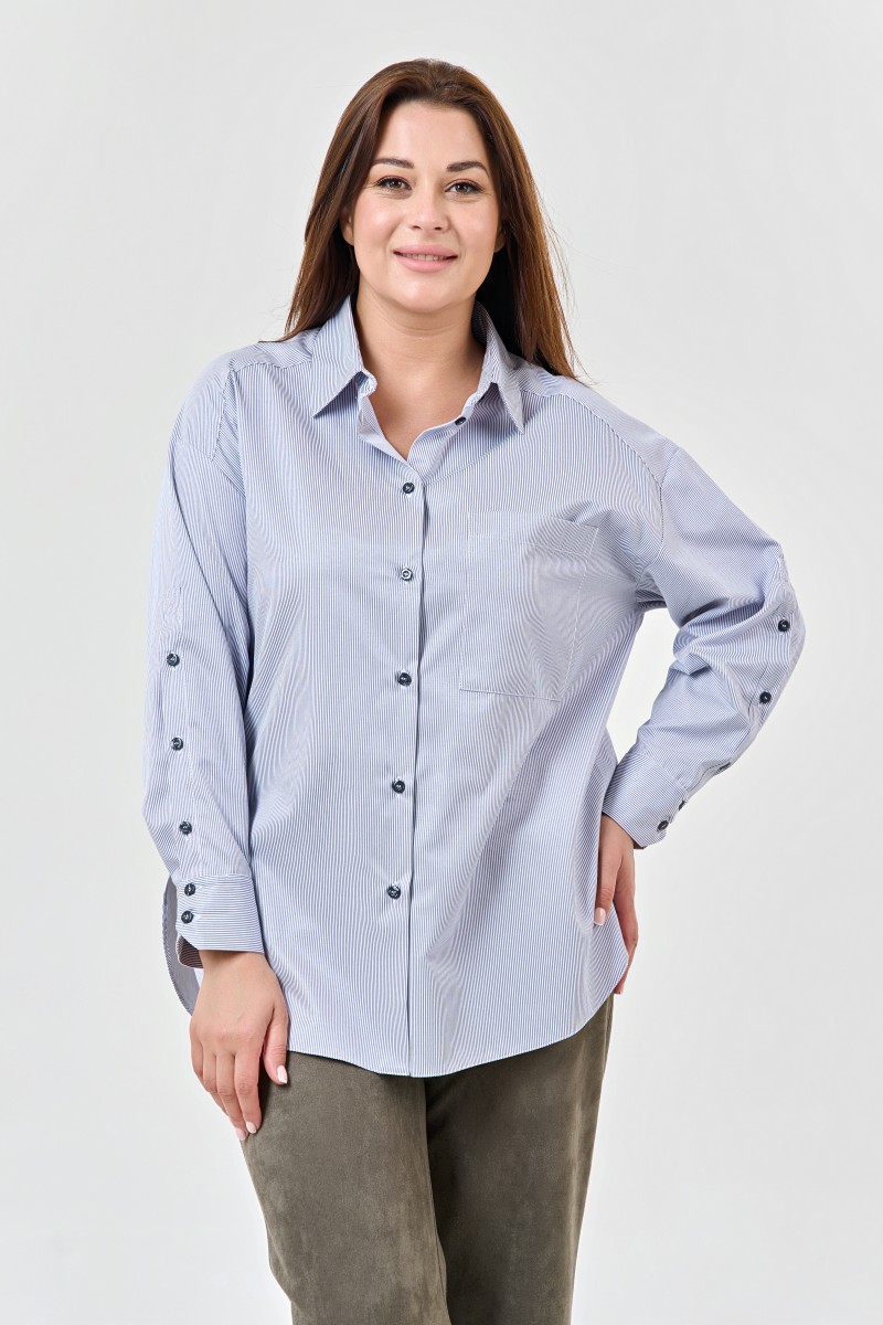 Блузка женская свободного силуэта с длинными рукавами и отложным воротником. Перед с накладным карманом по левой части и центральной застежкой на 7 петель и пуговиц. Спинка на кокетке.Низ изделия фигурный спинка длинее передней части.Рукава с манжетами застегивающимися на 2 петли и пуговицы.