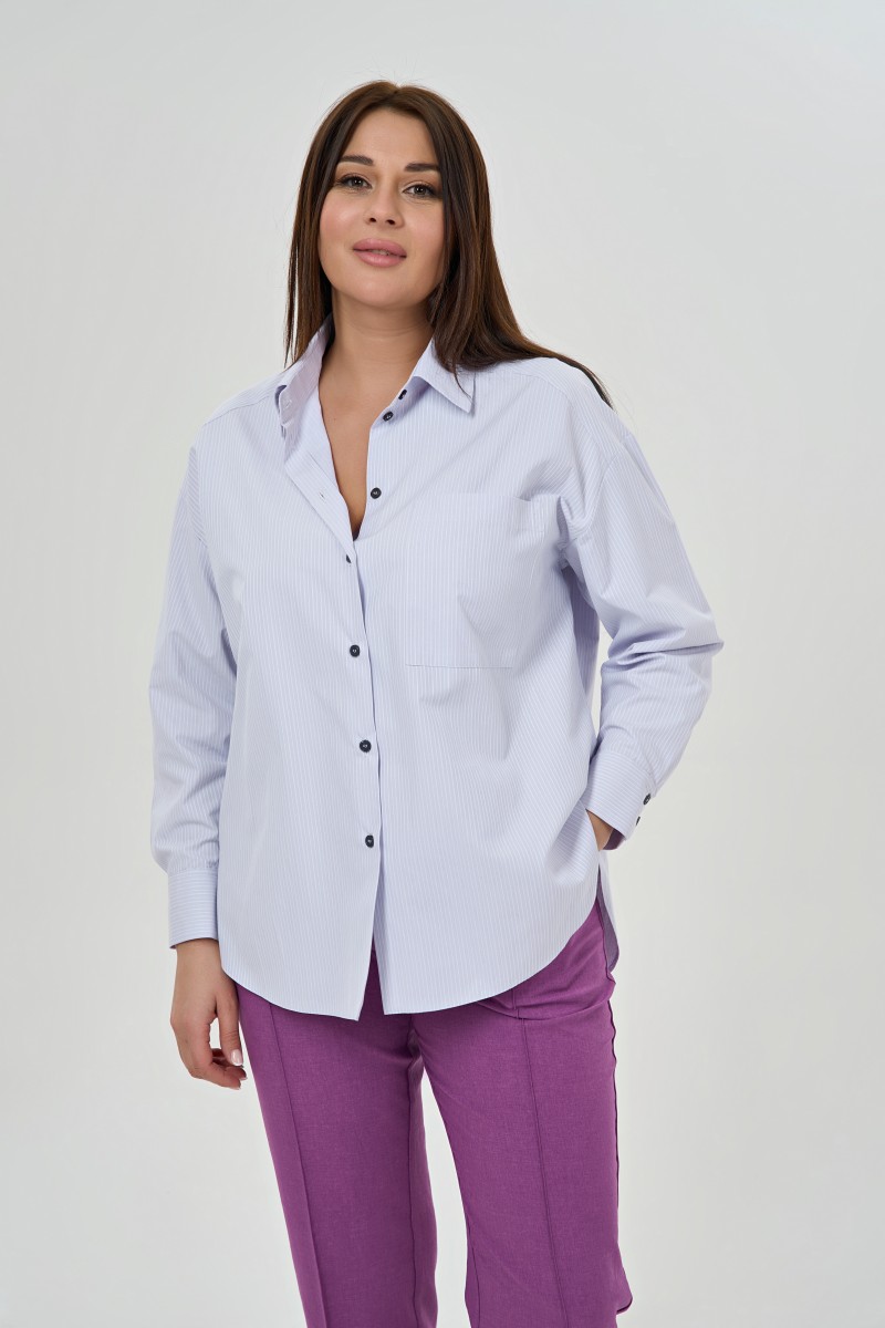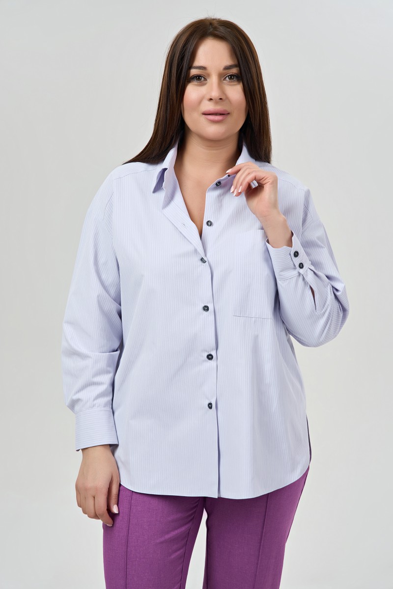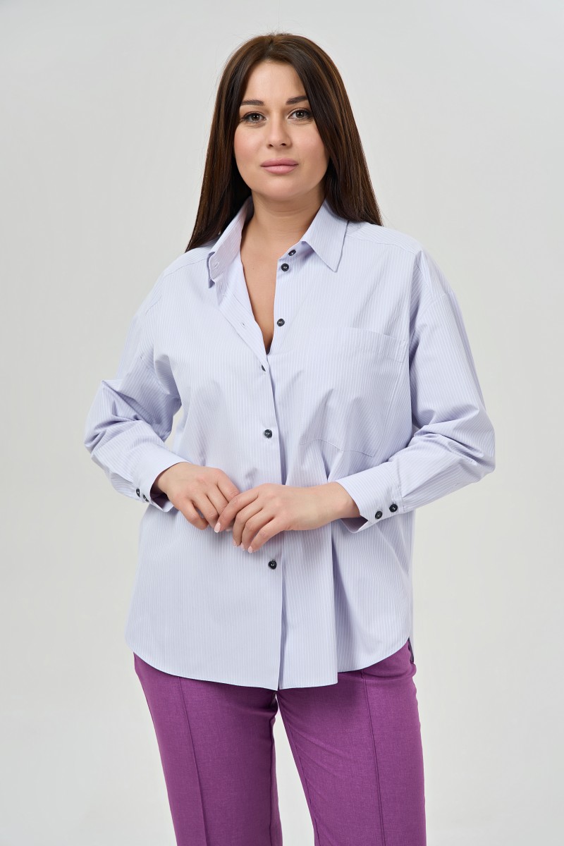 Блузка женская свободного силуэта с длинными рукавами. Перед с накладным карманом по левой части и центральной застежкой на 7 петель и пуговиц. Спинка на кокетке. Низ изделия фигурный спинка удлинена относительно переда.