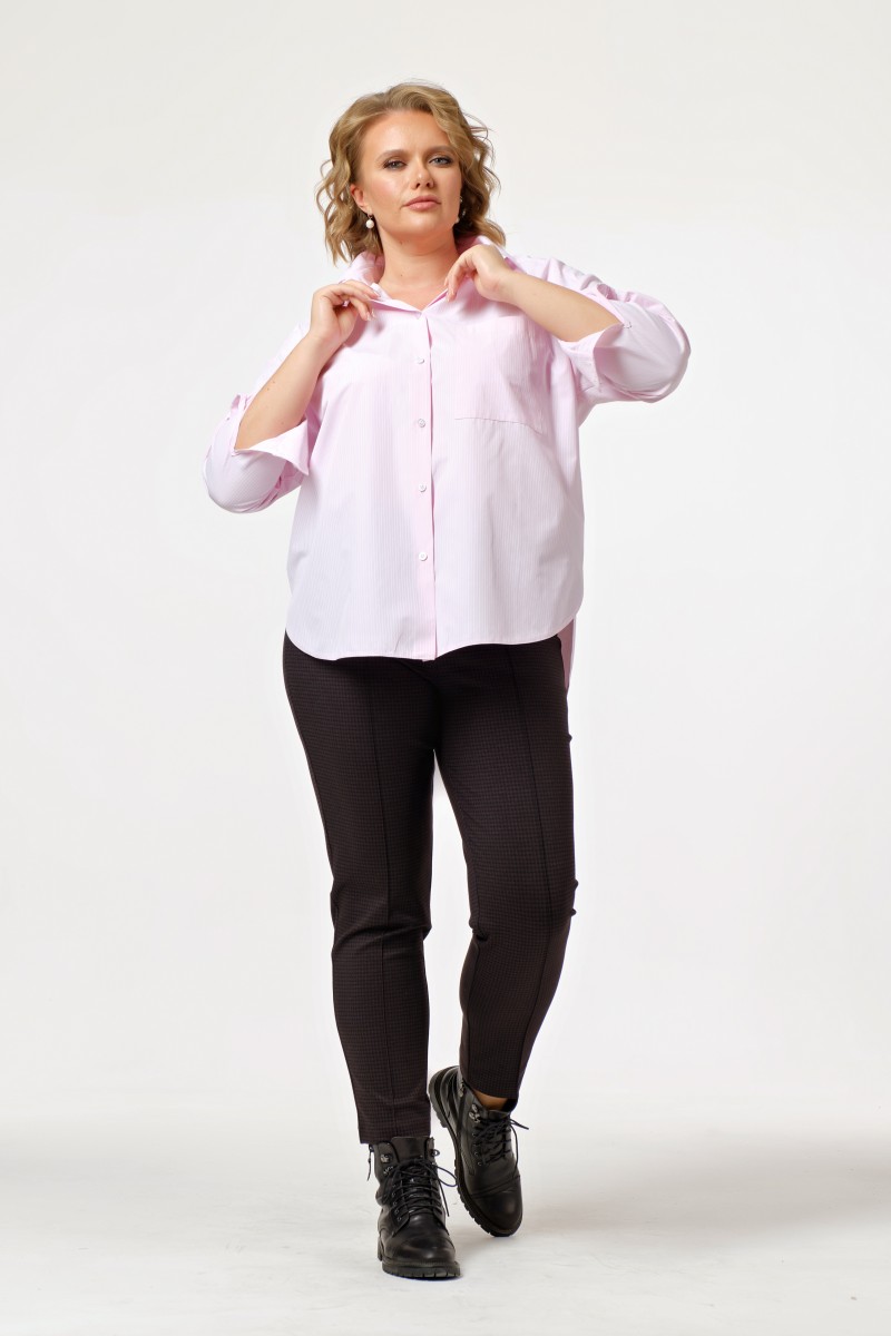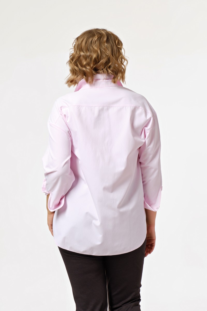 Блузка женская свободного силуэта с длинными рукавами. Перед с накладным карманом по левой части и центральной застежкой на 7 петель и пуговиц. Спинка на кокетке. Низ изделия фигурный спинка удлинена относительно переда.