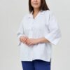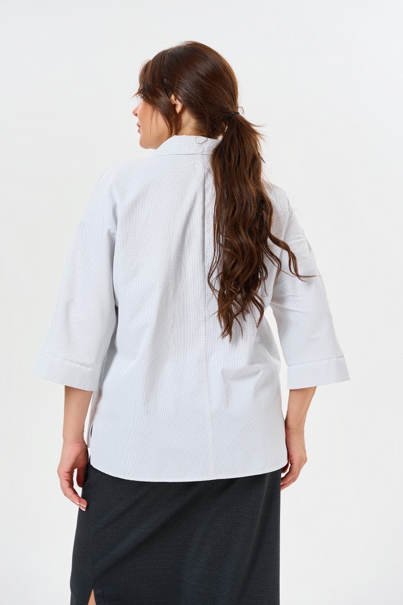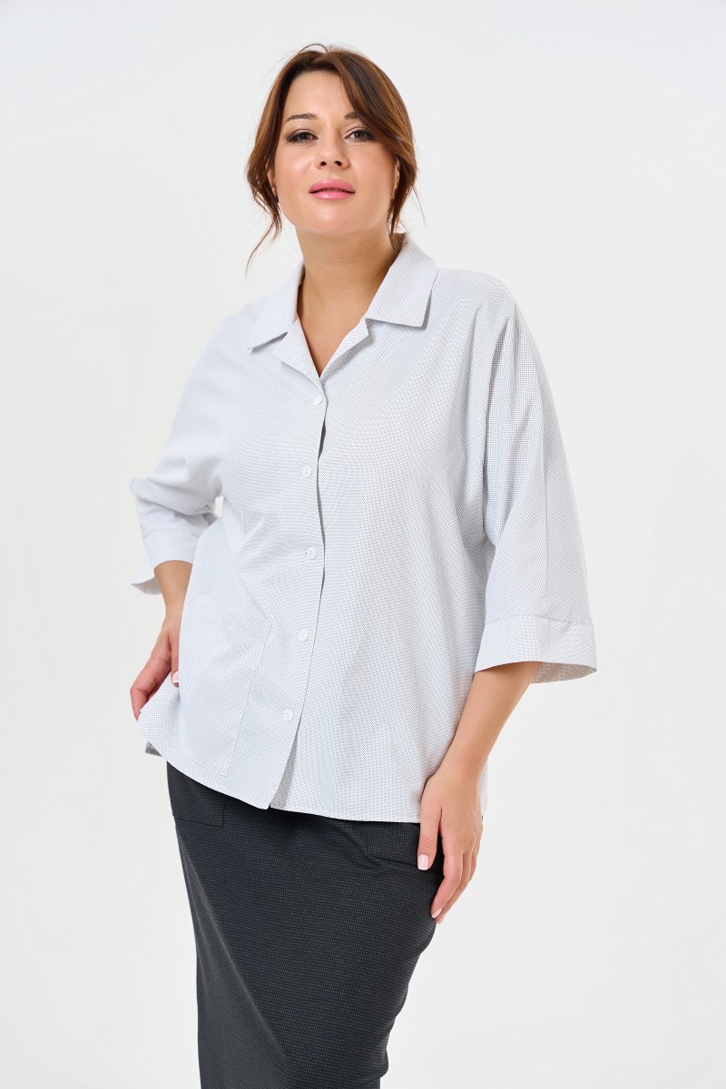 Рубашка женская прямого силуэта рукава цельнокроеные длиной 3/4 с притачной манжетой.Спинка со средним швом. По переду центральная застежка на петли и пуговицы на правой части переда накладной карман.Воротник с лацканом пиджачного типа. По боковым швам разрезы. Перед короче спинки.