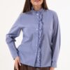Рубашка женская прямого силуэта. Перед с супатной застежкой по центру на 6 пуговиц. Спинка на кокетке по середине заложена встречная складка. Боковые швы с треугольными вставками скошены к линии низа. Низ спинки удлинен относи