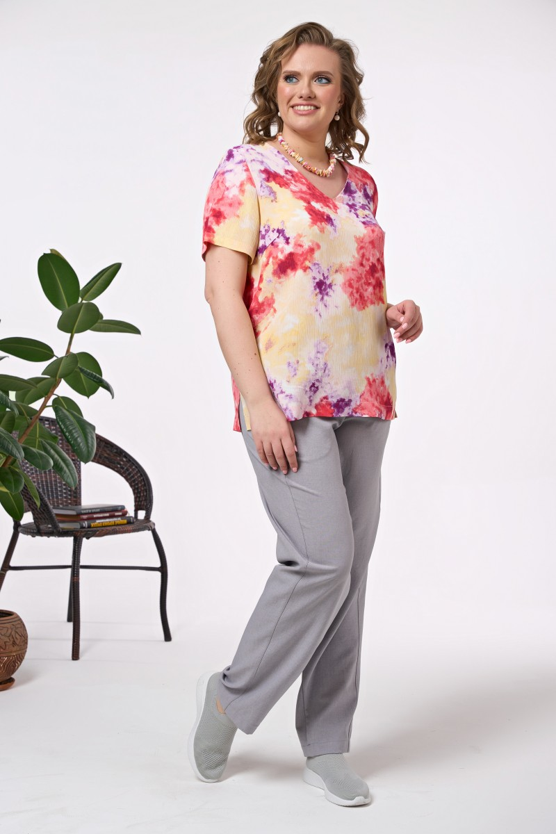 Эта блузка станет ярким акцентом в гардеробе благодаря необычному акварельному принту в розово-фиолетовой гамме. Прямой силуэт не сковывает движения а V-образный вырез красиво обрамляет декольте и визуально удлиняет шею. Короткие рукава создают легкий непринужденный образ идеальный для теплого сезона.Мягкая вискоза приятна к телу и отлично драпируется создавая естественные складки. Материал дышит и не сковывает движения даже в самый жаркий день. Боковые разрезы по низу добавляют модели современности и делают ее еще более комфортной.Блузка прекрасно сочетается с деловыми прямыми брюками для офиса – яркий принт оживит строгий дресс-код. С зауженными брюками получится элегантный образ для вечернего выхода. Для прогулок и путешествий можно комбинировать с джинсами или свободными брюками-бананами.Модель подходит для деловых встреч где хочется проявить индивидуальность летних вечеринок и романтических свиданий. Универсальная длина позволяет носить блузку заправленной или навыпуск создавая разные по наст