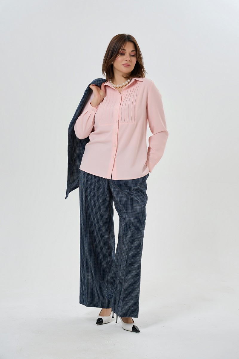 Нежный розовый оттенок превращает строгую классику в изысканную основу гардероба. Изящные складки на груди создают женственный силуэт а четкие линии воротника подчеркивают статус.