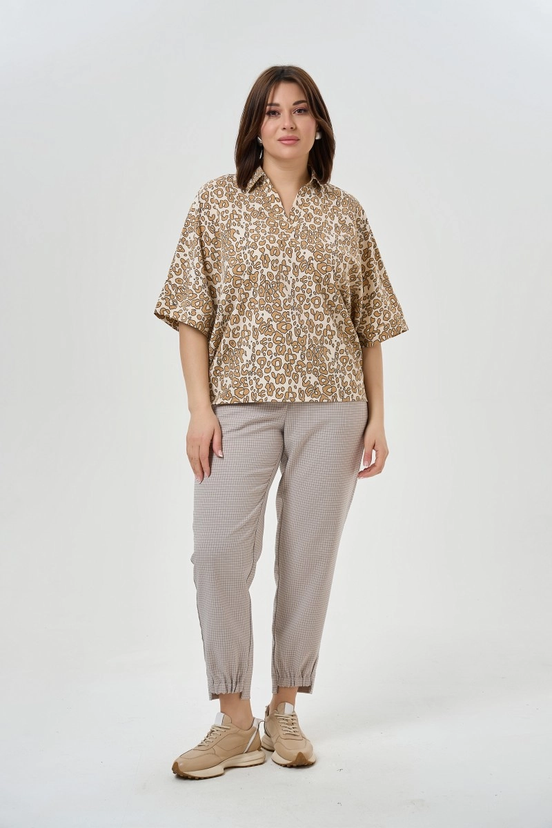 Свободный силуэт этой блузки позволяет чувствовать себя комфортно от утреннего кофе до вечерних планов. Рукава три четверти – компромисс между деловым стилем и непринужденностью casual образов. Такая длина рукава подходит для офиса и остается актуальной на дружеской встрече.Леопардовый принт превращает базовую вещь в statement piece. С брюками-карандашом создается интересный деловой лук с характером. Джинсы и эта блузка – формула стильного повседневного образа для городских прогулок.Натуральный состав ткани обеспечивает комфорт при носке в любую погоду. V-образный вырез визуально удлиняет шею и подходит для украшений.Свободный крой не сковывает движения и подходит разным типам фигур. Блузка легко вписывается в капсульный гардероб и сочетается с базовыми вещами. Рукава с аккуратно оформленными краями добавляют завершенности образу. Универсальная модель для тех кто ценит комфорт и стиль одновременно.
