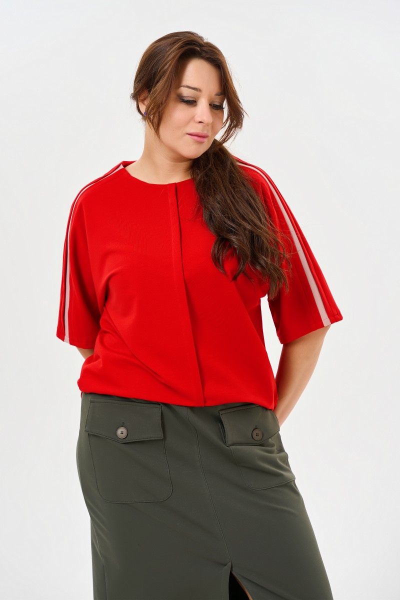 Красная блузка из мягкого трикотажа становится центром любого образа благодаря насыщенному цвету и элегантной складке спереди. Контрастная светлая полоса вдоль плеч добавляет современности классическому силуэту. Рукава до локтя и свободный крой дарят ощущение легкости в движениях.