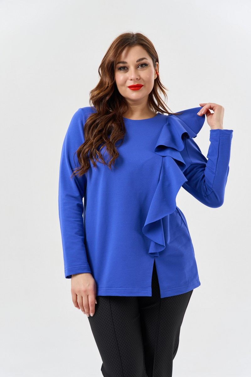 Эта синяя блузка с эффектным воланом спереди станет тем самым акцентом который превратит повседневный образ в запоминающийся. Свободный силуэт не сковывает движения и подходит для любой фигуры. Волан создает красивую вертикальную линию и добавляет объема в нужном месте.Округлый вырез горловины смотрится мягко и женственно а длинный рукав делает блузку универсальной для делового образа или дружеской встречи. Разрез по низу добавляет динамики и современности.Насыщенный синий цвет освежает лицо и прекрасно сочетается с черными брюками для офиса или джинсами для casual прогулок. С юбкой получается элегантный женственный образ для свидания или вечеринки.Качественная ткань держит форму и не мнется что особенно важно для активного ритма жизни. Эта блузка одинаково хороша и для деловой встречи и для романтического ужина – достаточно правильно подобрать аксессуары и низ.
