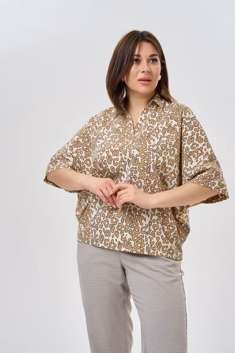 Свободный силуэт этой блузки позволяет чувствовать себя комфортно от утреннего кофе до вечерних планов. Рукава три четверти – компромисс между деловым стилем и непринужденностью casual образов. Такая длина рукава подходит для офиса и остается актуальной на дружеской встрече.Леопардовый принт превращает базовую вещь в statement piece. С брюками-карандашом создается интересный деловой лук с характером. Джинсы и эта блузка – формула стильного повседневного образа для городских прогулок.Натуральный состав ткани обеспечивает комфорт при носке в любую погоду. V-образный вырез визуально удлиняет шею и подходит для украшений.Свободный крой не сковывает движения и подходит разным типам фигур. Блузка легко вписывается в капсульный гардероб и сочетается с базовыми вещами. Рукава с аккуратно оформленными краями добавляют завершенности образу. Универсальная модель для тех кто ценит комфорт и стиль одновременно.