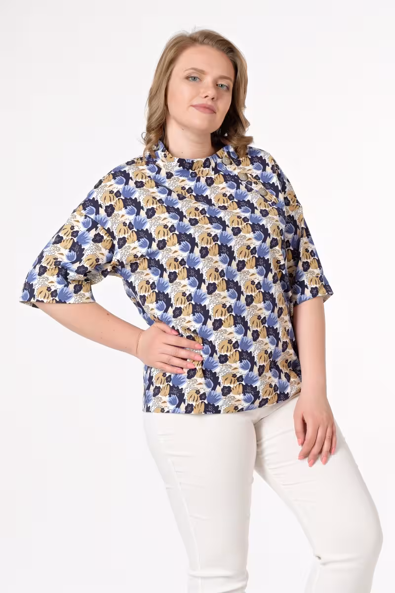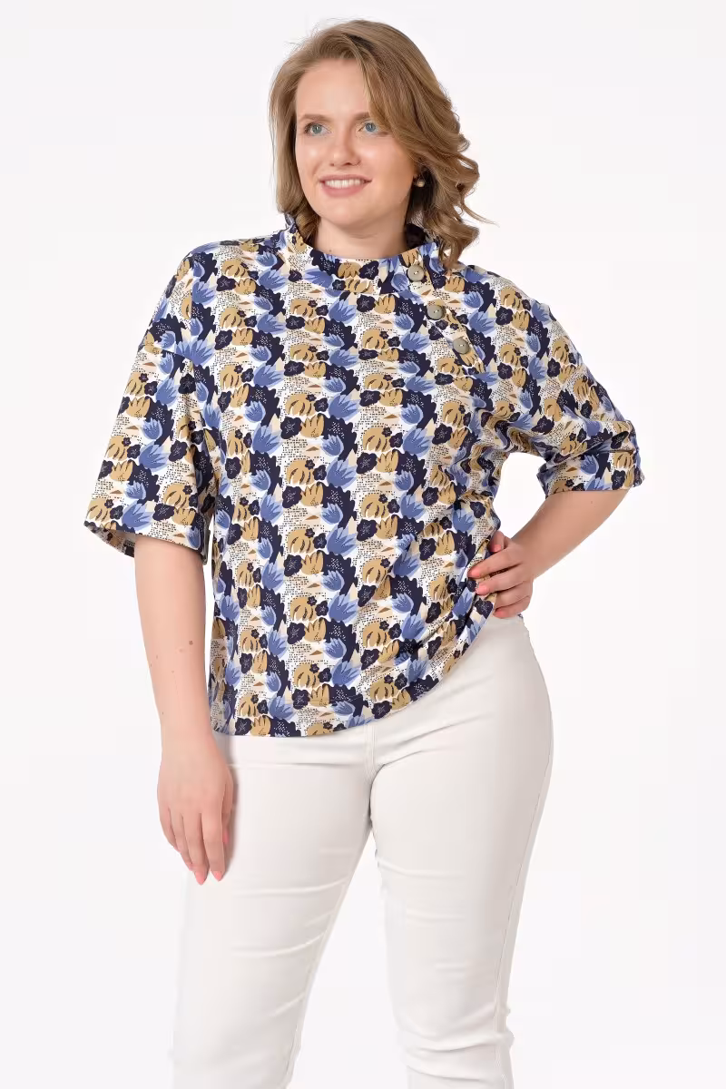 Свободная блузка с художественным принтом станет основой для создания элегантных образов в разных ситуациях. Удлиненный силуэт до линии бедер визуально вытягивает фигуру и создает красивые пропорции. Спущенное плечо придает модели современный расслабленный характер.Воротник-стойка добавляет строгости делая блузку подходящей для деловых встреч и офисных будней. Планка с тремя пуговицами смещена от центра что создает интересную асимметрию. Рукава длиной семь восьмых с зафиксированными отворотами выглядят аккуратно и стильно.Принт в сине-золотистой гамме с абстрактными мотивами универсален для сочетаний. С брюками-карандашом получится строгий деловой лук а с джинсами – непринужденный casual-образ для дружеских встреч. Юбка-карандаш создаст женственный силуэт для свиданий или вечеринок.Качественная ткань обеспечивает комфорт в течение всего дня. Свободный крой не сковывает движений позволяя чувствовать себя уверенно в любой ситуации.