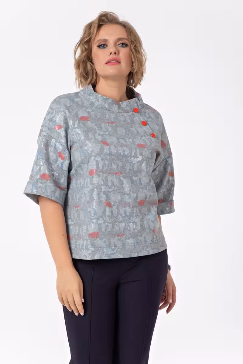 Свободная блузка с необычной асимметричной застежкой на три красные пуговицы. Воротник-стойка добавляет структуры образу а рукав три четверти с подвернутыми краями создает непринужденность. Идеальный баланс между деловым стилем и casual настроением.