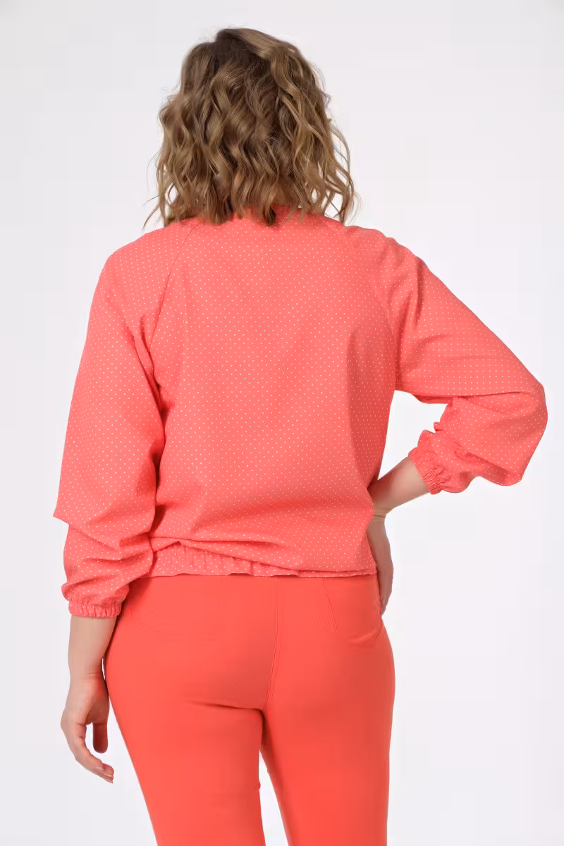 Яркая коралловая блузка в белый горошек превратит обычный день в маленький праздник. Молния спереди и удобные карманы делают образ одновременно игривым и практичным.