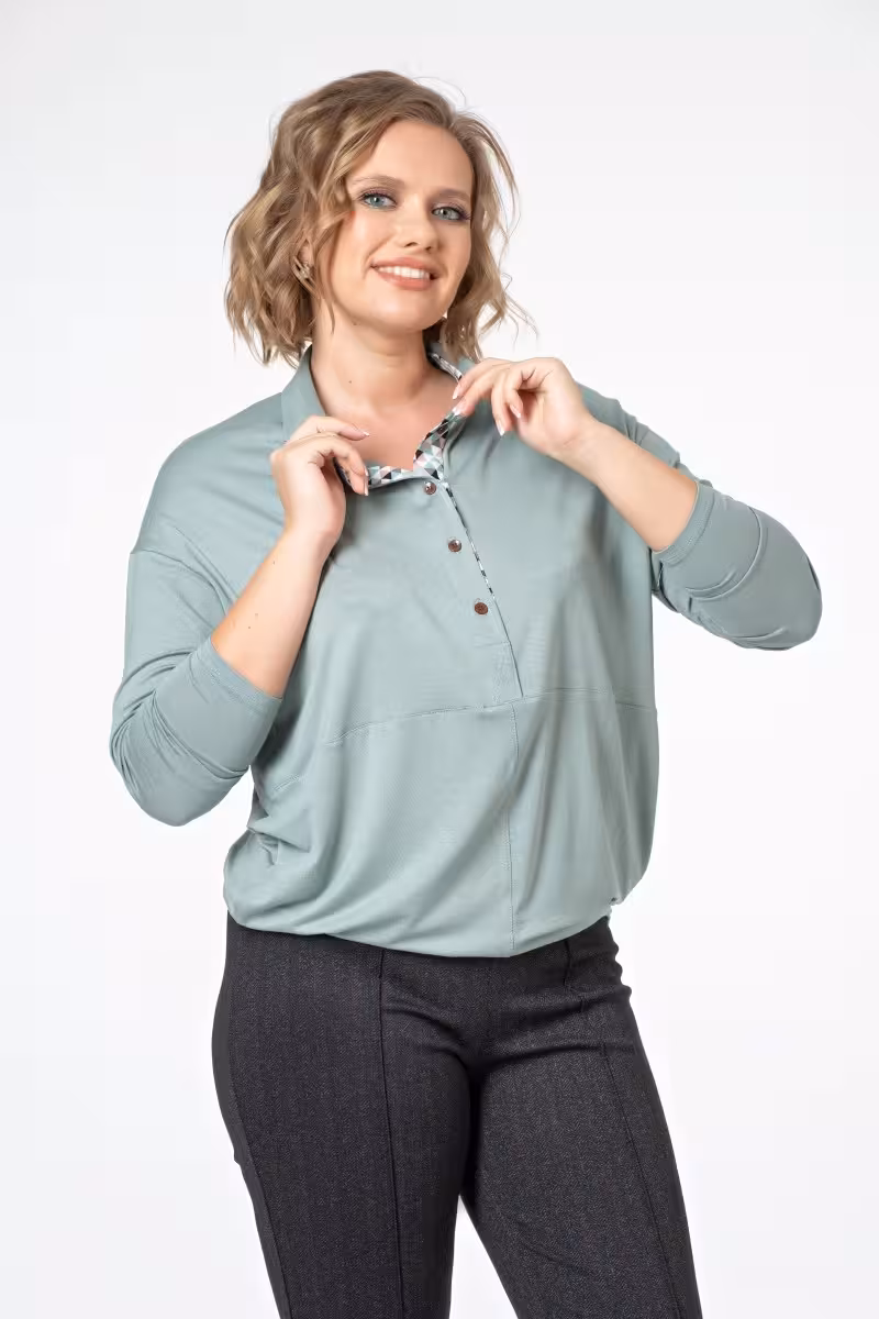 Спортивная блузка мятного оттенка воплощает философию активного городского стиля. Свободный оверсайз силуэт с деликатным сужением к низу создает женственную линию не ограничивая движений. Пять пуговиц по центру добавляют структурности повседневному образу.Опущенная линия плеча и заниженная пройма формируют непринужденный casual силуэт. Отложной воротник на стойке придает блузке спортивную элегантность. Горизонтальное деление по талии визуально структурирует фигуру создавая гармоничные пропорции.Мягкая ткань обеспечивает комфорт в течение всего дня. Блузка органично сочетается с джинсами для прогулок по городу или спортивными брюками для активного досуга. Подходит для дружеских встреч походов в кафе неформальных рабочих дней в creative-индустрии.Нежный мятный оттенок освежает образ и легко комбинируется с базовыми цветами гардероба. Такая блузка станет основой для создания современных луков в стиле urban casual.