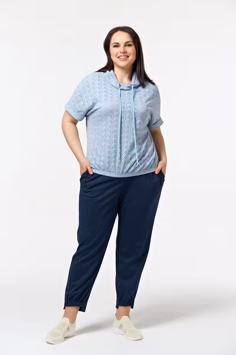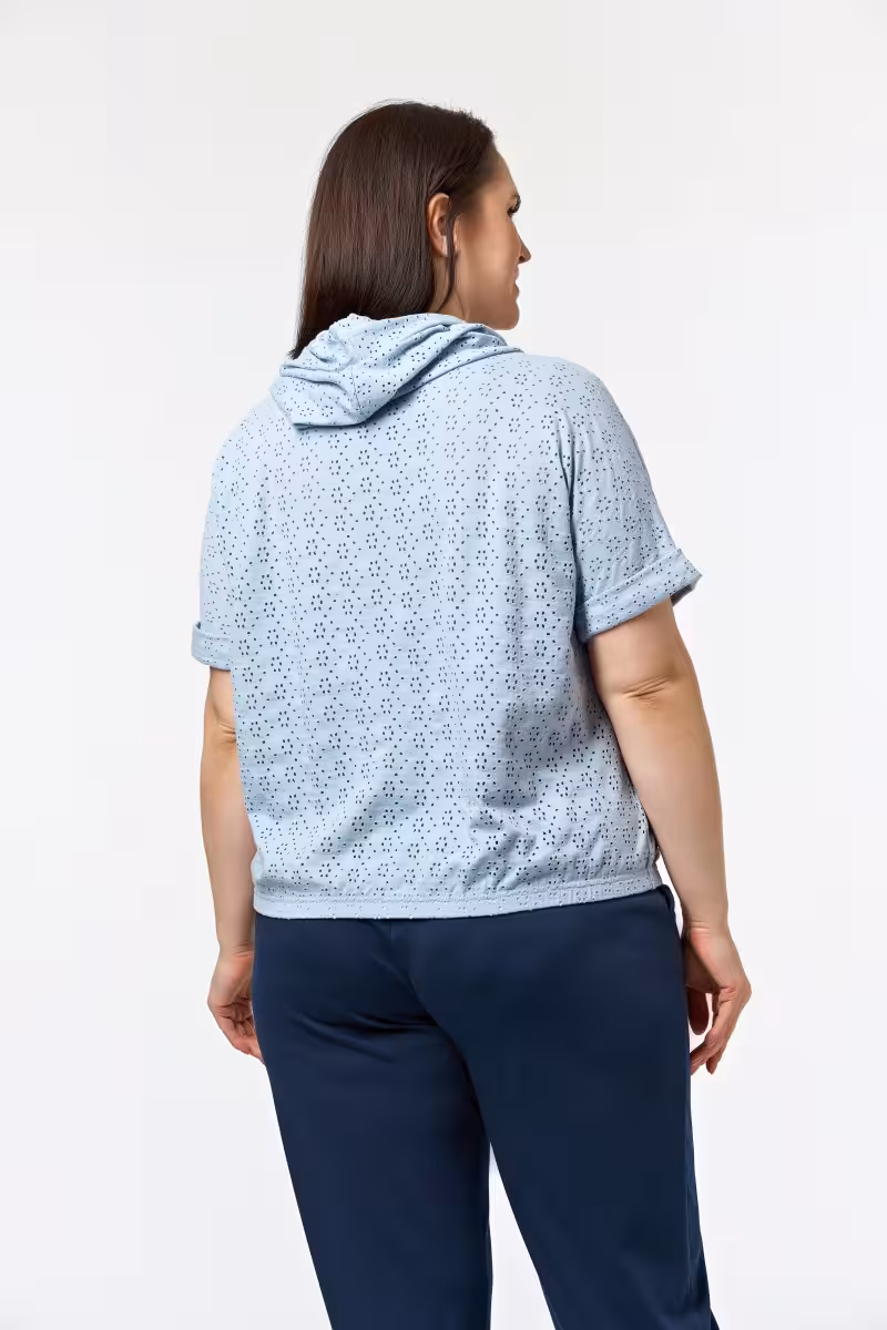Блузка свободного силуэта с капюшоном — находка для тех кто ценит комфорт без ущерба стилю. Округлый вырез плавно переходит в практичный капюшон на завязках который можно носить как декоративный элемент или использовать по назначению в прохладную погоду.Короткие рукава с аккуратно обработанными краями создают четкие линии не перегружая образ. Особенность модели — резинка по низу которая деликатно формирует силуэт и позволяет регулировать длину блузки под настроение.Свободная форма делает эту блузку универсальной для разных типов фигуры. В сочетании с джинсами получается идеальный casual-образ для дружеских встреч или шопинга. С брюками создает расслабленный офисный лук для креативных профессий.Качественный трикотаж обеспечивает комфорт на весь день и сохраняет форму после стирки. Модель легко вписывается в капсульный гардероб благодаря нейтральной палитре и лаконичному крою.